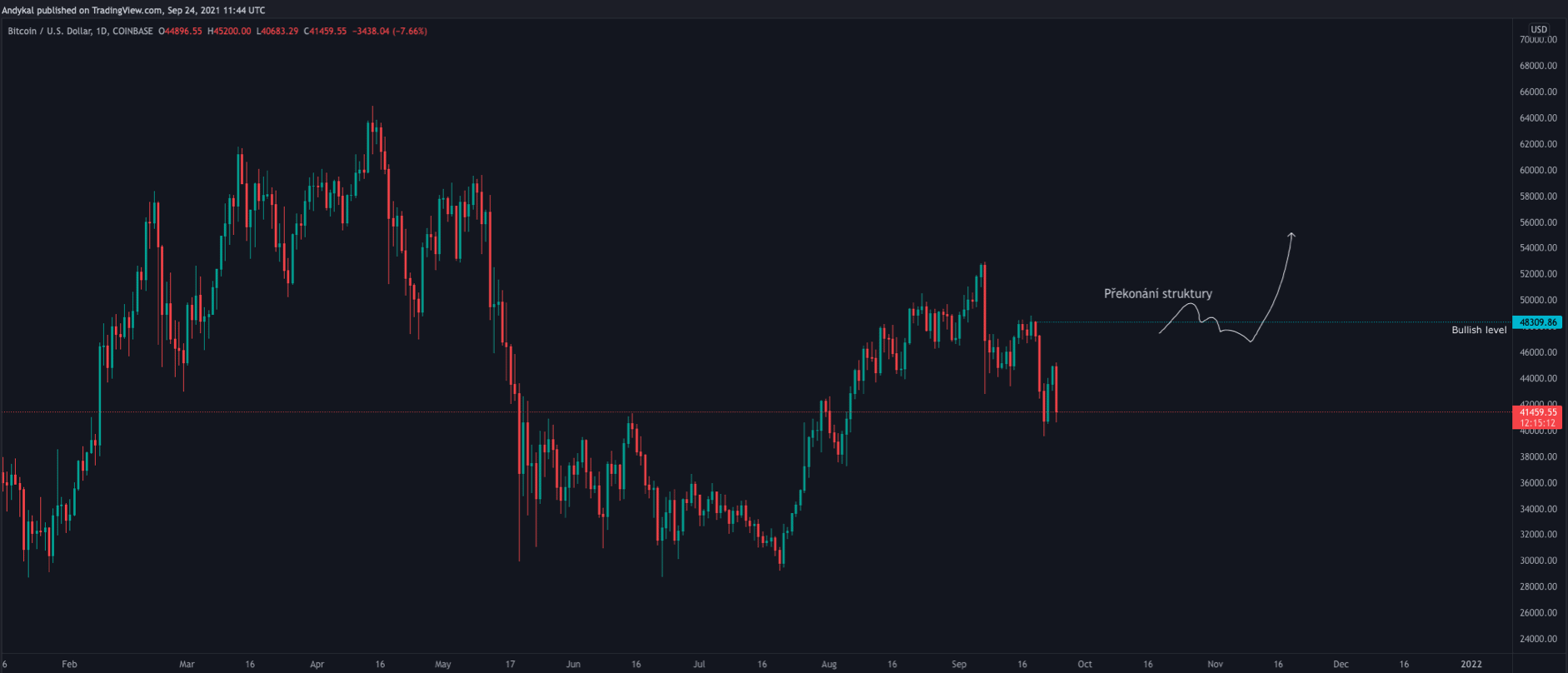 Bitcoin začne být bullish, až překoná poslední swing high, které je v této chvíli na ceně 48.292 USD (v grafu níže vyznačeno jako bulish level). Pokud tedy uzavře denní svíce výše než na 48.300 USD, můžeme si být na 90 % jistí, že náš scénář byl správně – tedy dno v našem supportu bylo finální a BTC bude časem pokračovat na nová ATH.