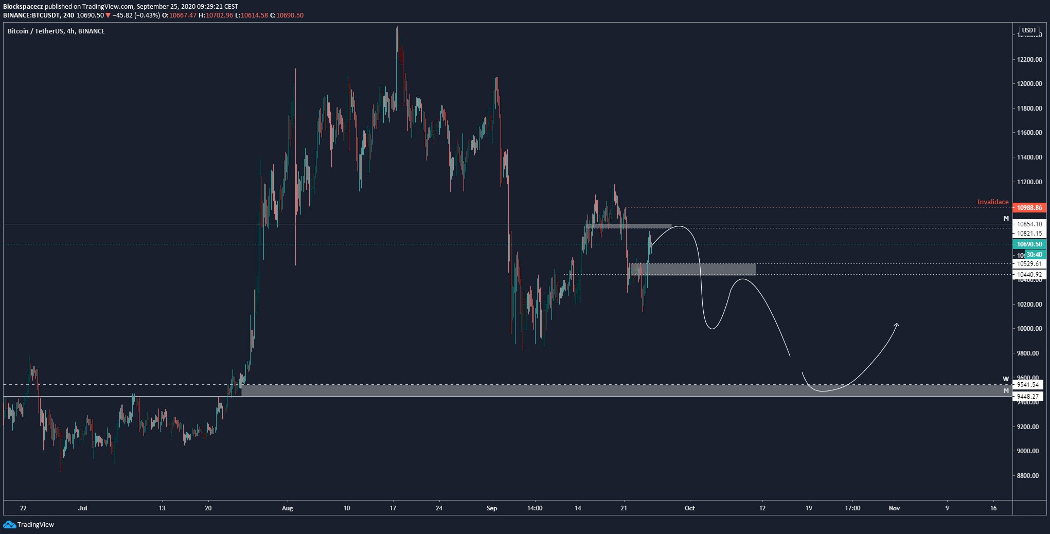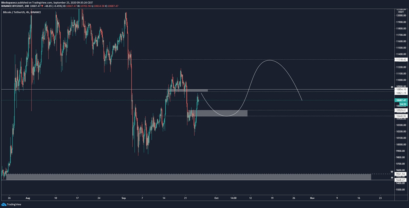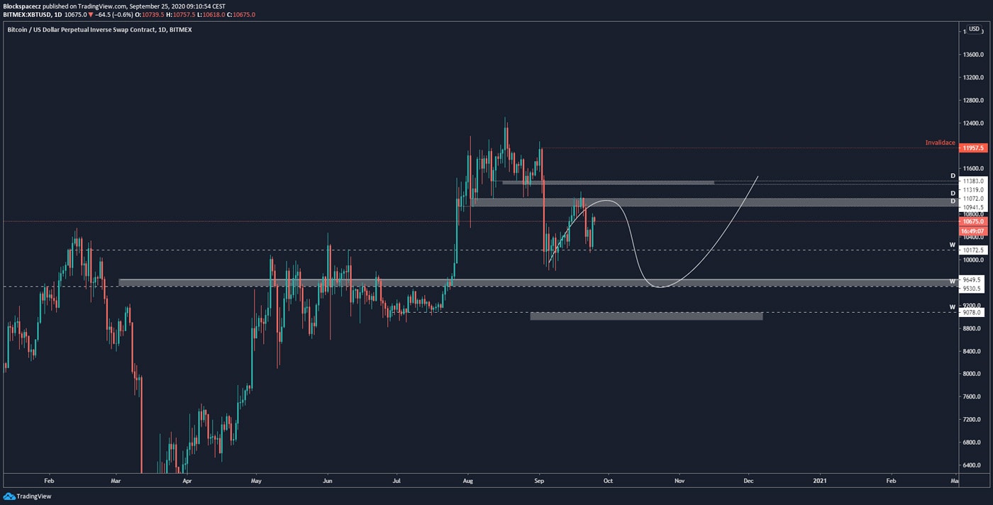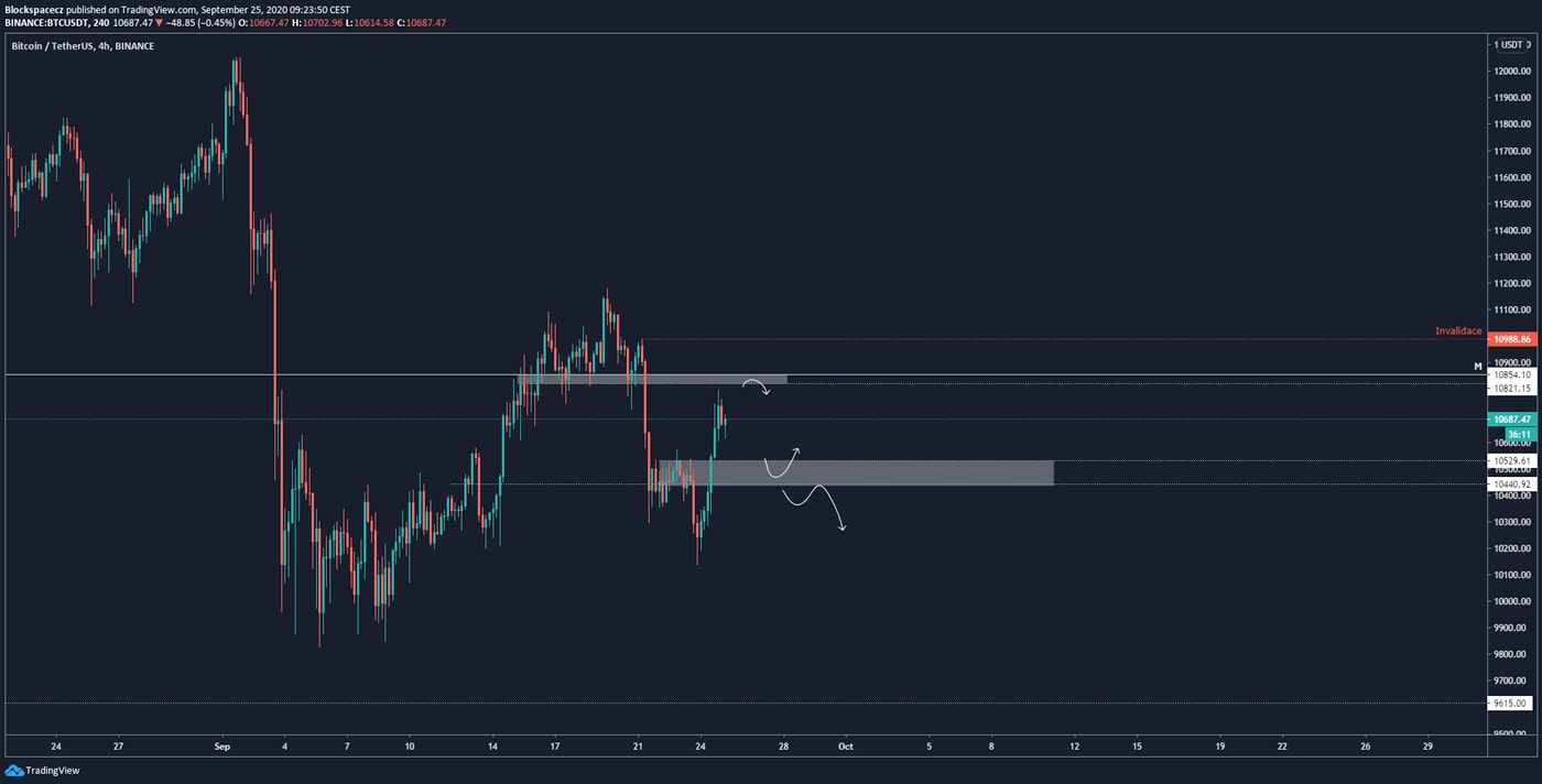 Odpověď na ní můžeme dostat buď při otestování supportu na cenové hladině 10 500 USD, anebo pokud by cena šla nad 11 tis USD, kde je invalidace bearish scénáře.