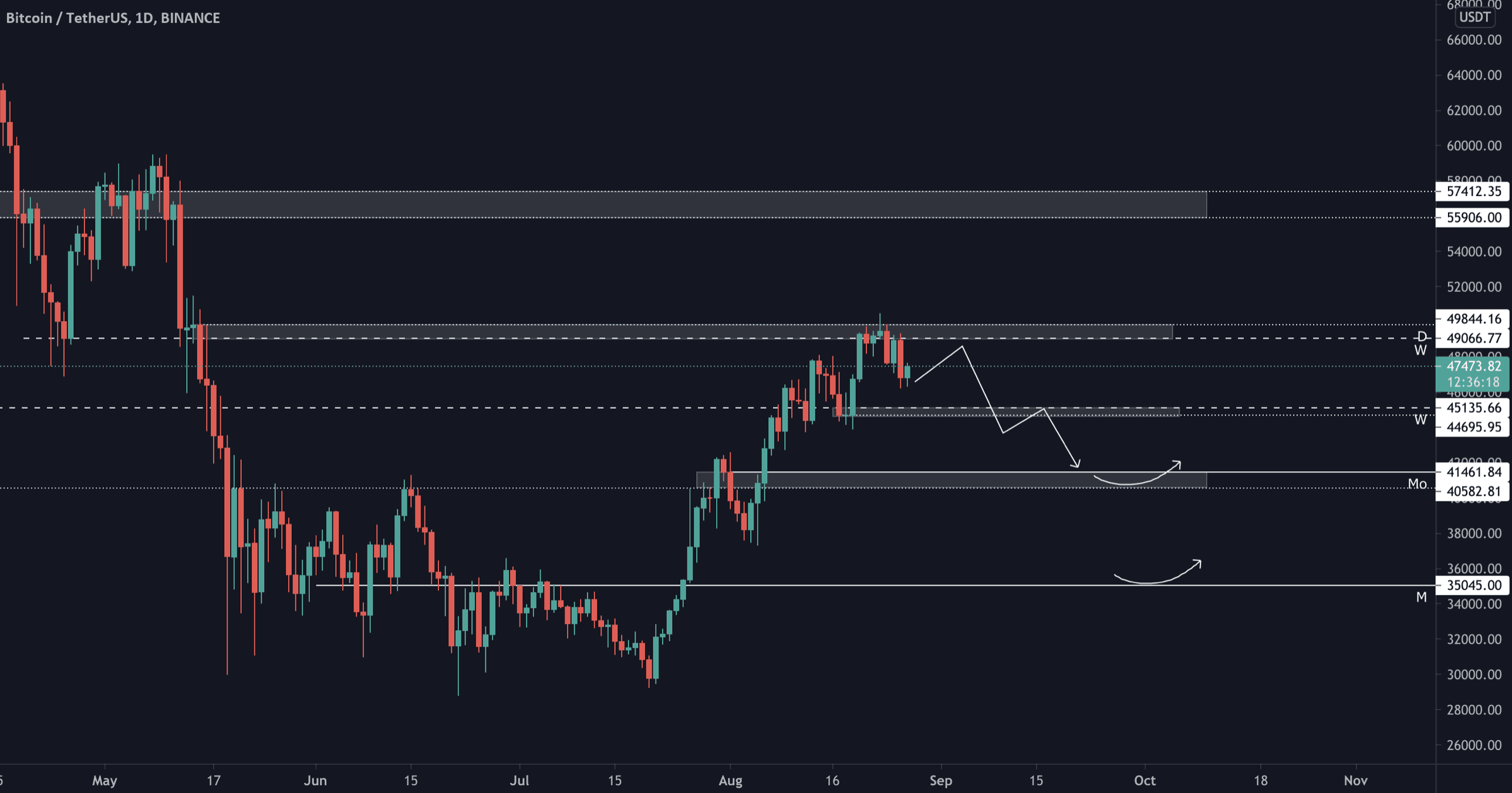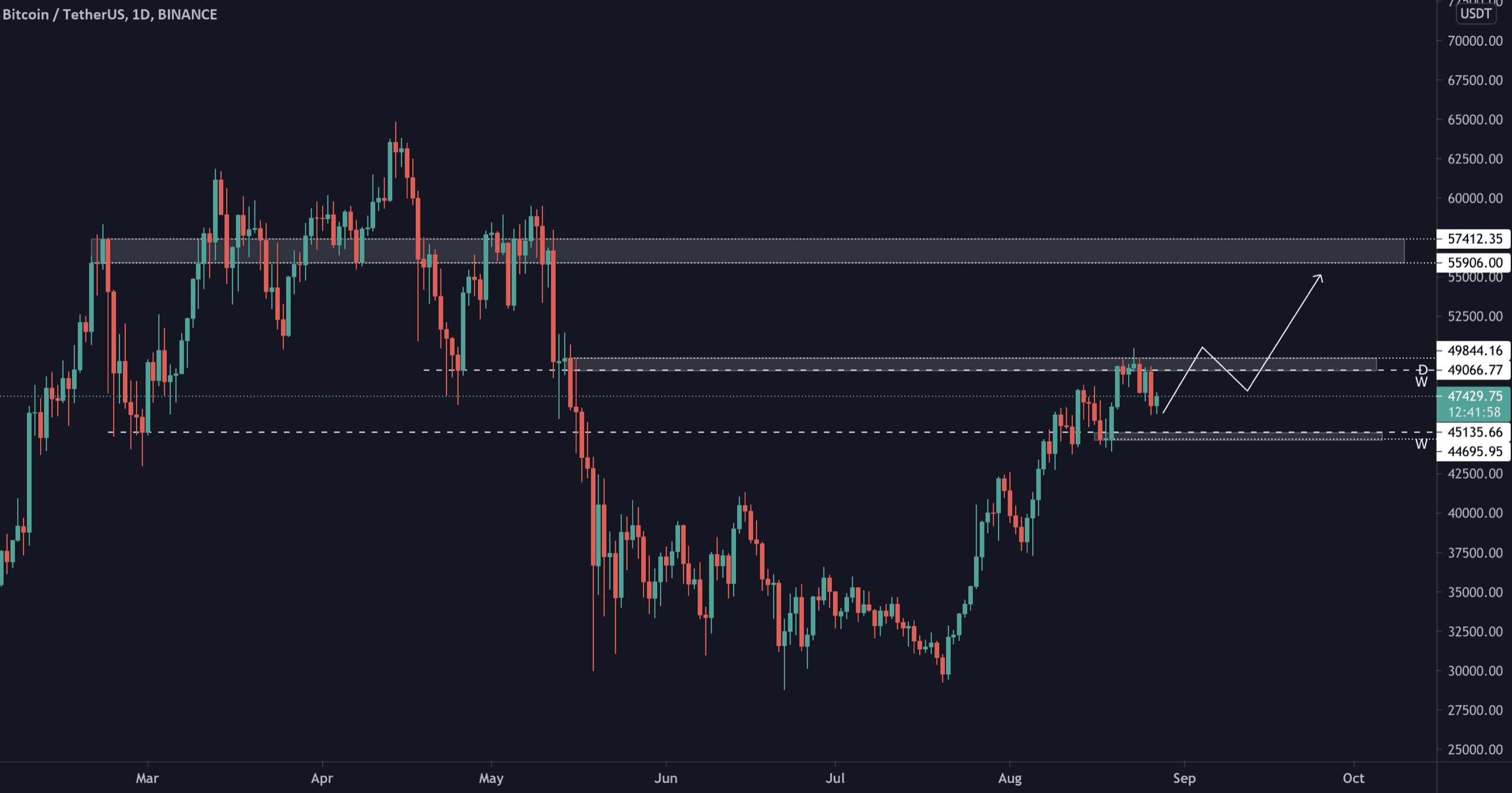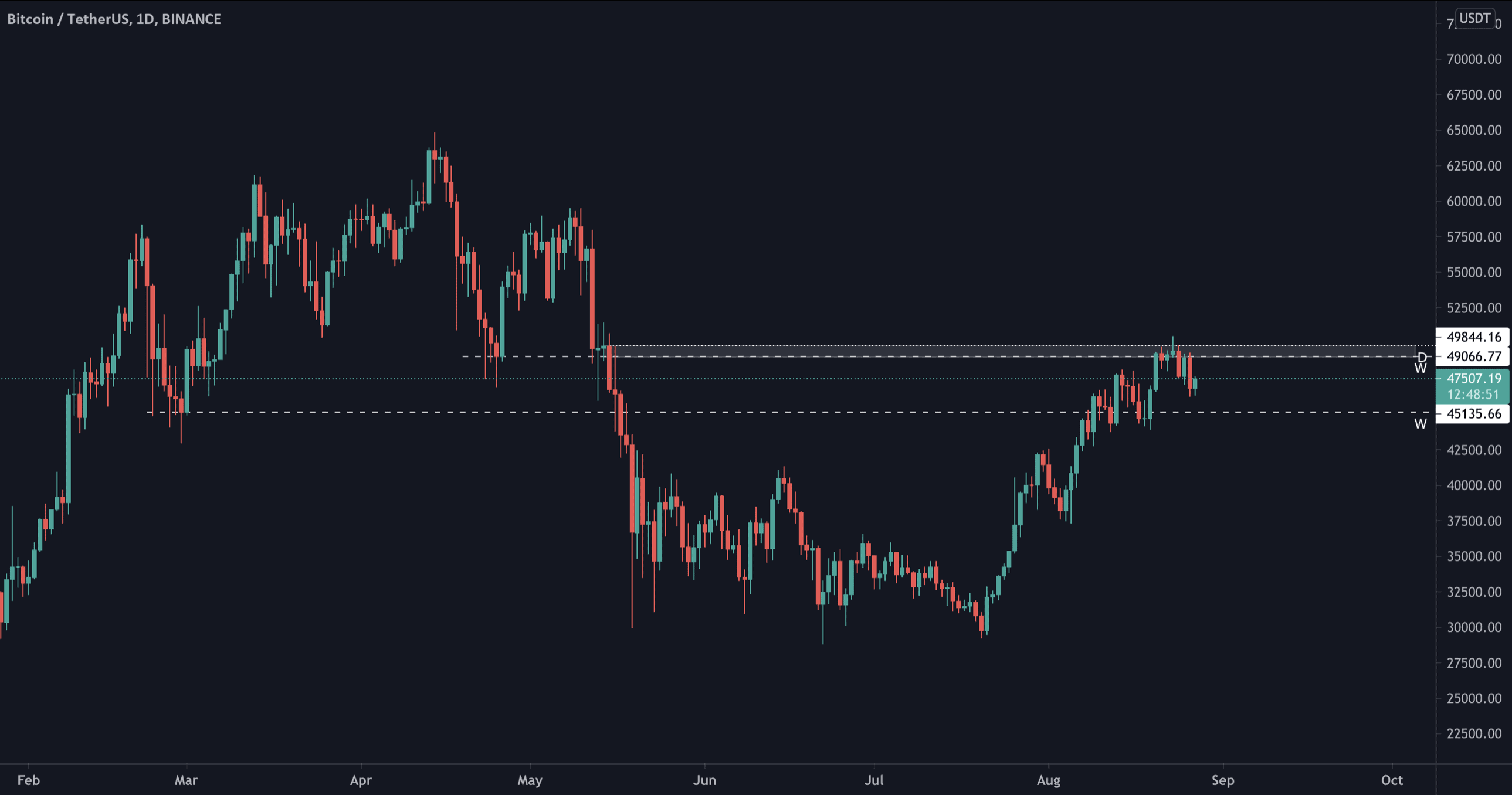 Pod 45 tis. USD se otevírá cesta k daleko hlubšímu pullbacku, a tedy příležitost pro shorty. Naopak nad 49 tis. USD pokračujeme v bullish trendu.