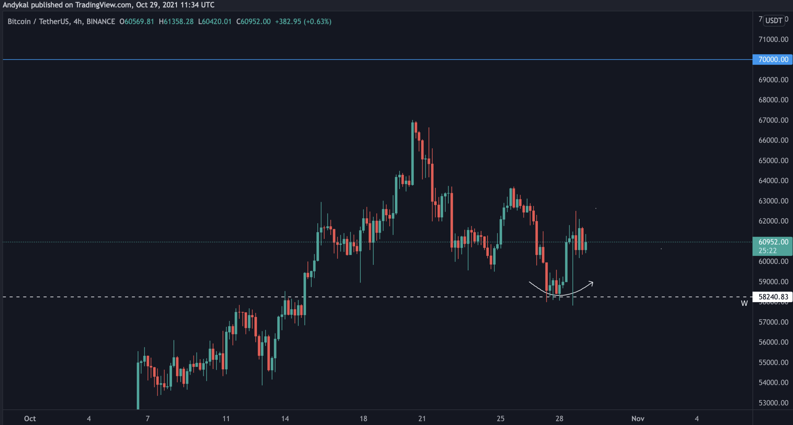 V nejbližším týdnu ale sledujme support 58-56 tis. USD, která má vysoké pravděpodobnosti odražení ceny vzhůru. Až přijde potvrzení konce korekce, je čas na longové obchody.
