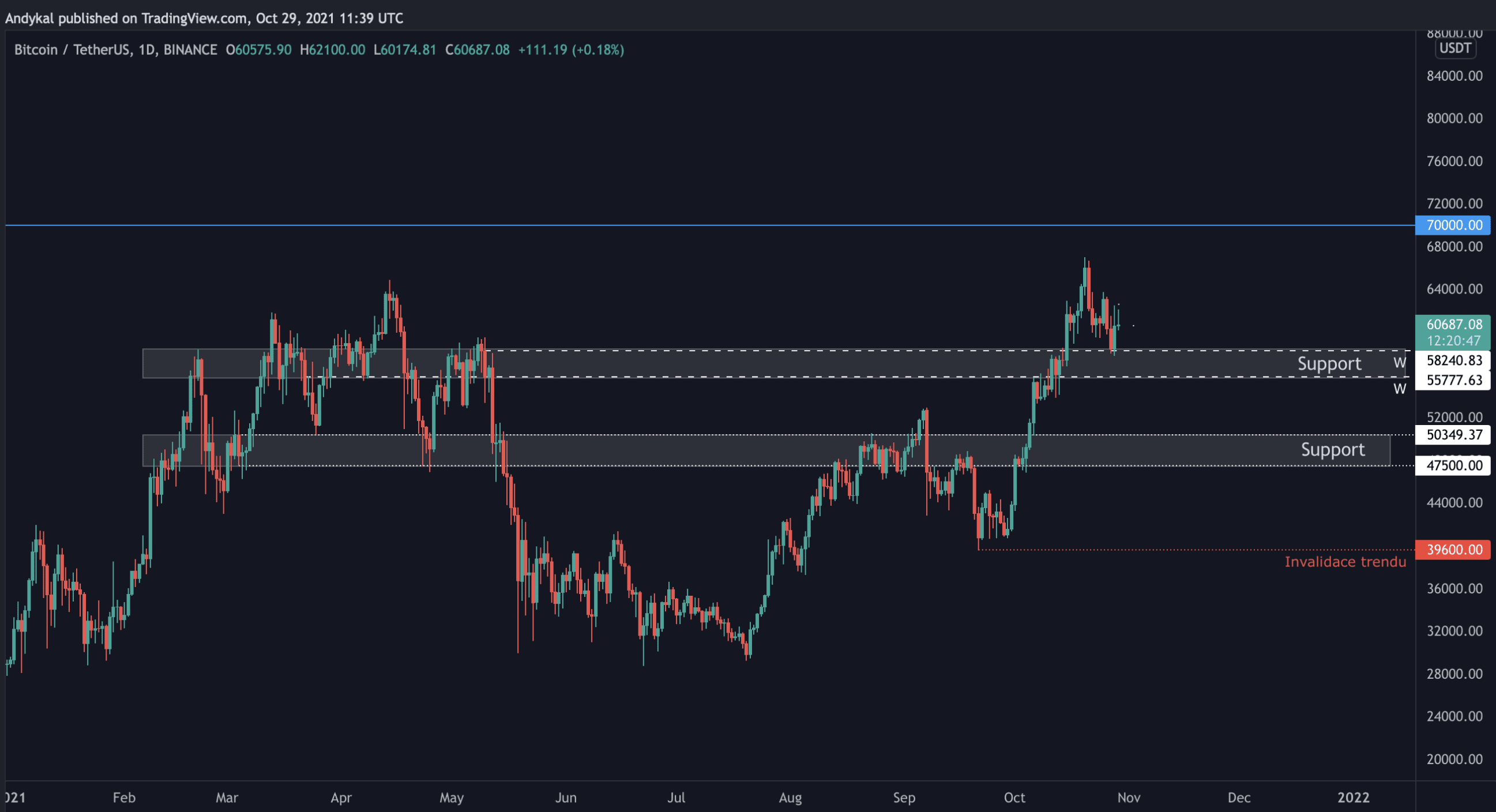 Invalidace dlouhodobého uptrendu BTC je až pod cenovou úrovní 40 000 USD. Pokud uvidíme Bitcoin znovu na těchto cenách, tak opravdu skončil bull market a je možný hluboký pullback až někam ke 20 tisícům. Vzhledem k tomu, že otevírací cena dnešního dne byla přes 60 500 USD, moc pravděpodobné to není.