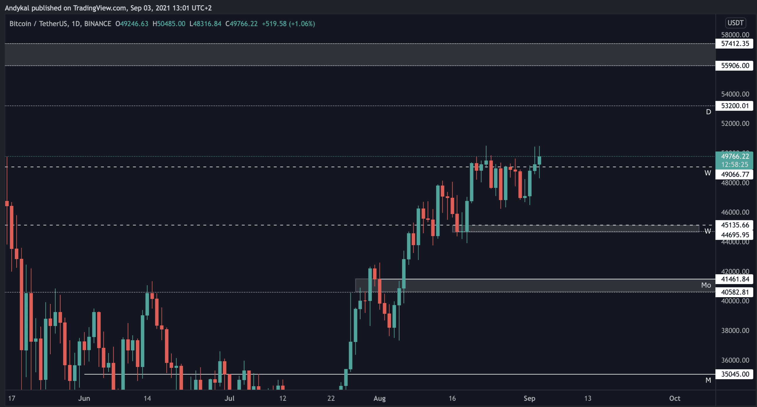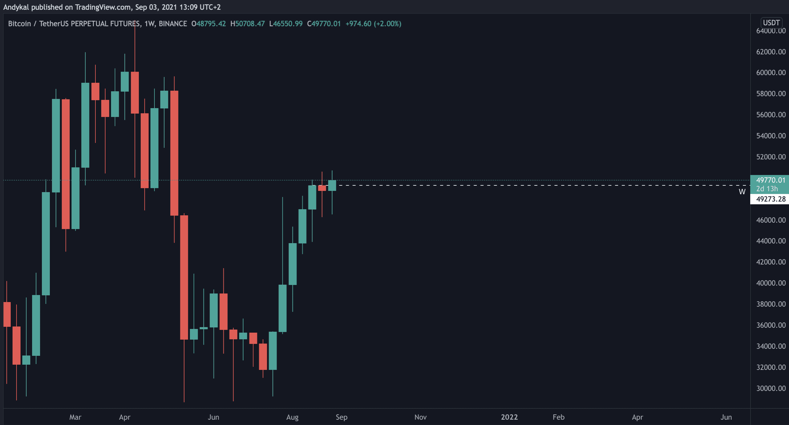 Dalším faktorem, který pro mě bude tento týden extrémně důležitý, je týdenní uzávěr. Minulý týden totiž Bitcoin vytvořil swing high na ceně 49300 USD. Pokud uzavře tento týden nad touto cenou, je téměř jistě potvrzené, že bullish trend ještě neskončil a pokračujeme výše.