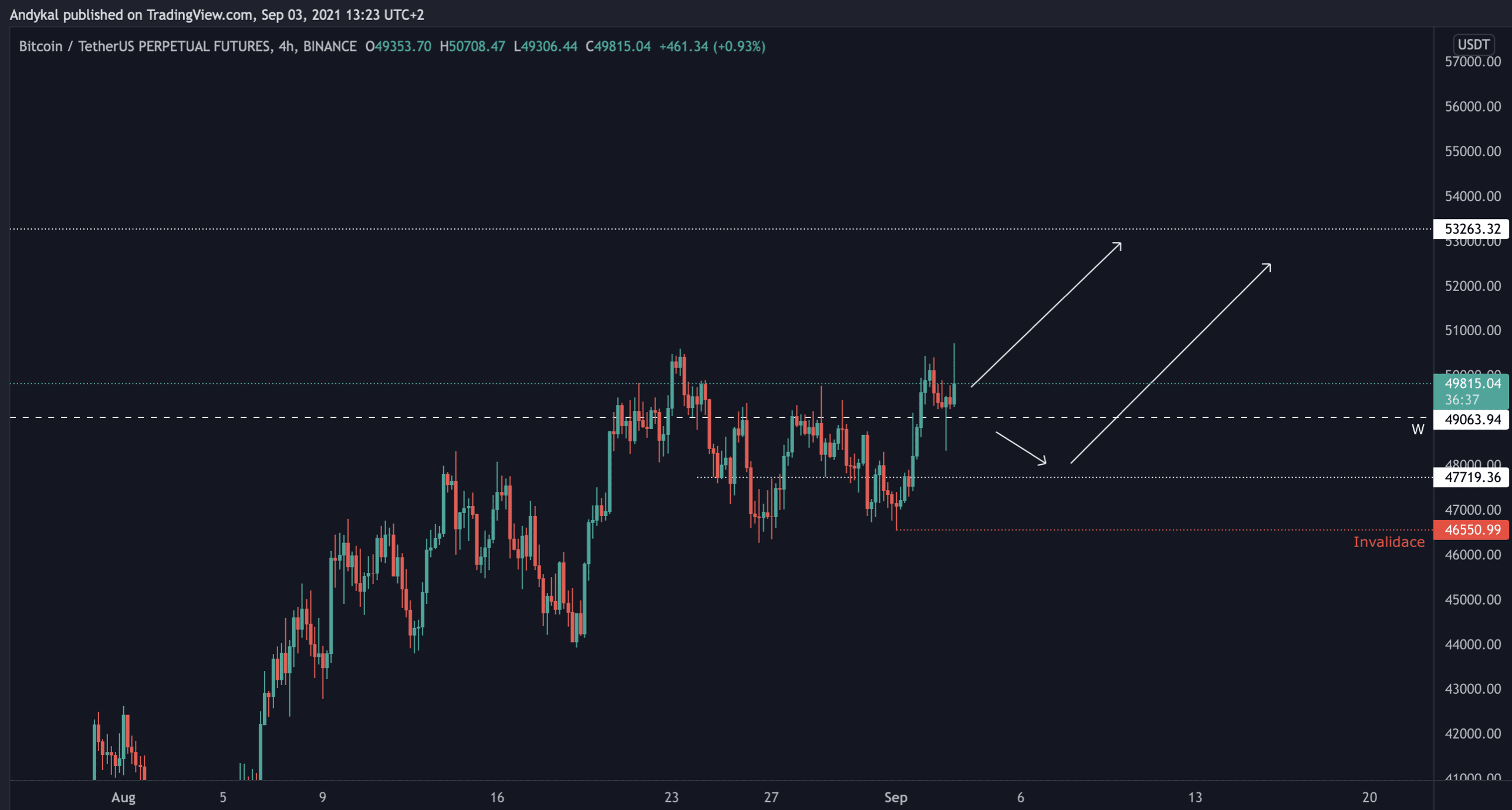 Aktivace bullish scénáře spočívala při denním uzávěru nad 49 tis. USD, ideálně 49,8 tis. USD. Včera uzavřela denní svíce na ceně 49250, takže “základní” podmínka breakoutu byla splněná. Šance se dost výrazně převážily na stranu býků.