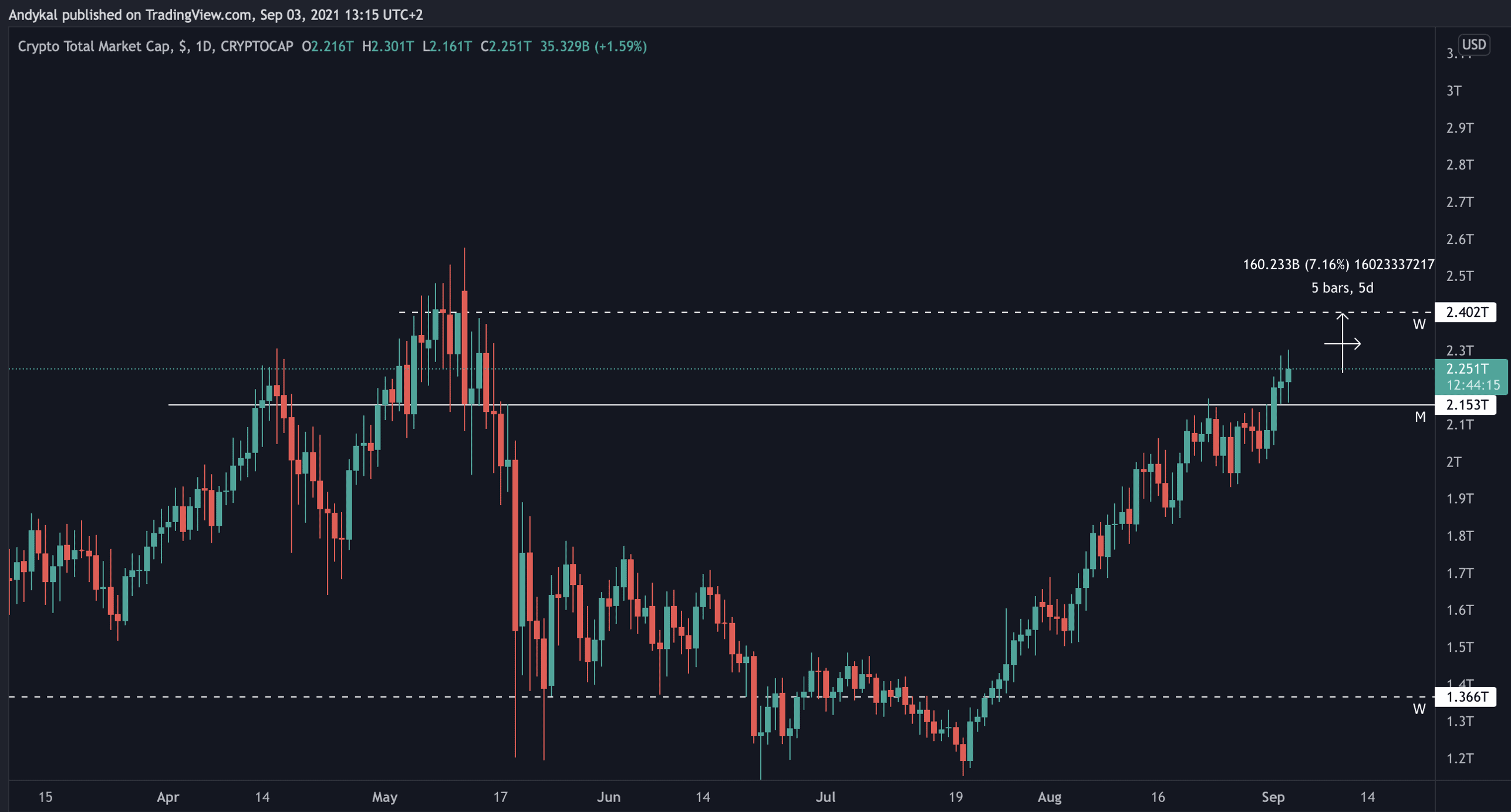 V předchozích článcích jsem vícekrát zmiňoval metriku tzv. total marketcapu – jde o celkovou kapitalizaci kryptoměnového trhu, která několik týdnů čelila rezistenci, takže jsme nemohli vědět, jaký bude výsledek.