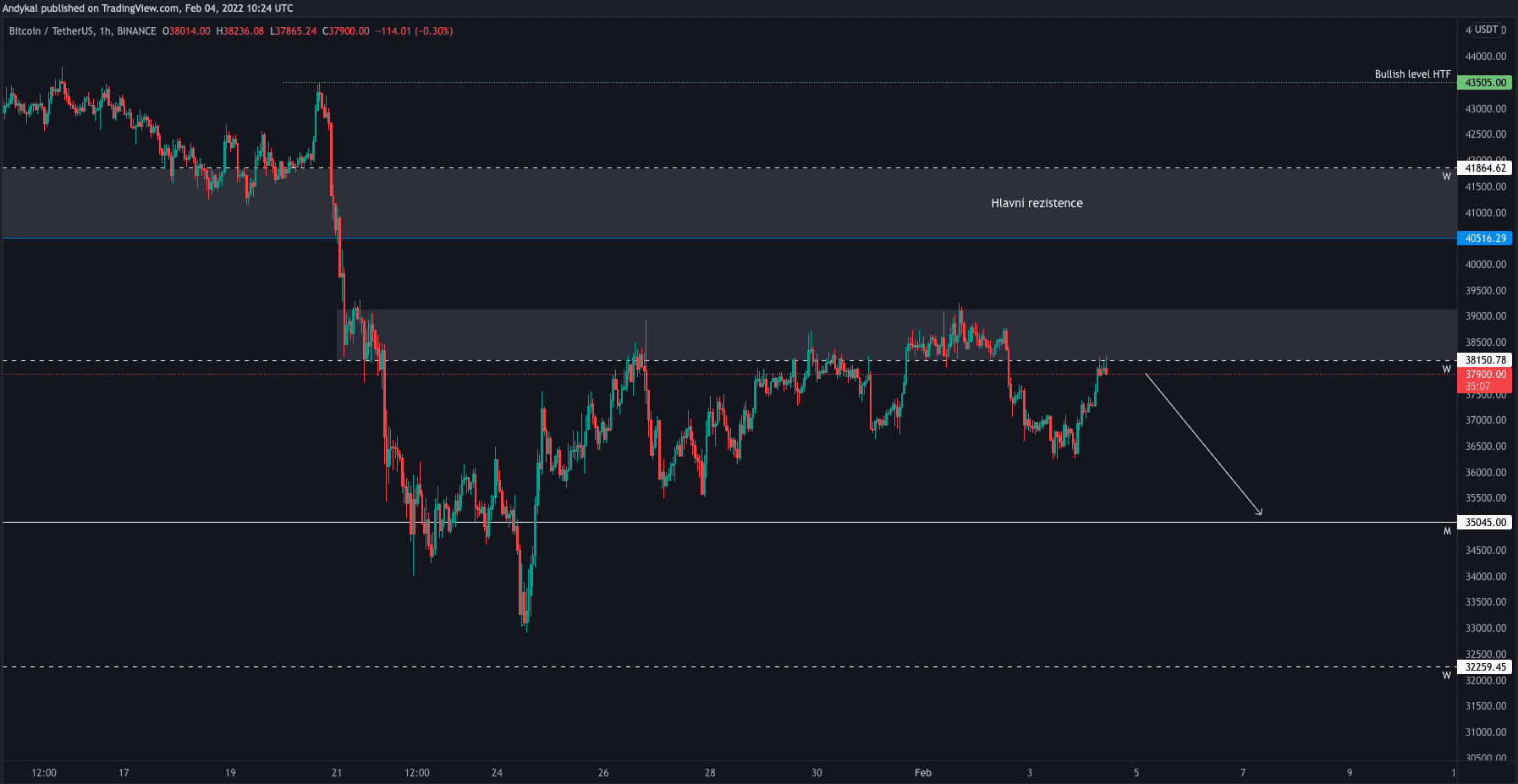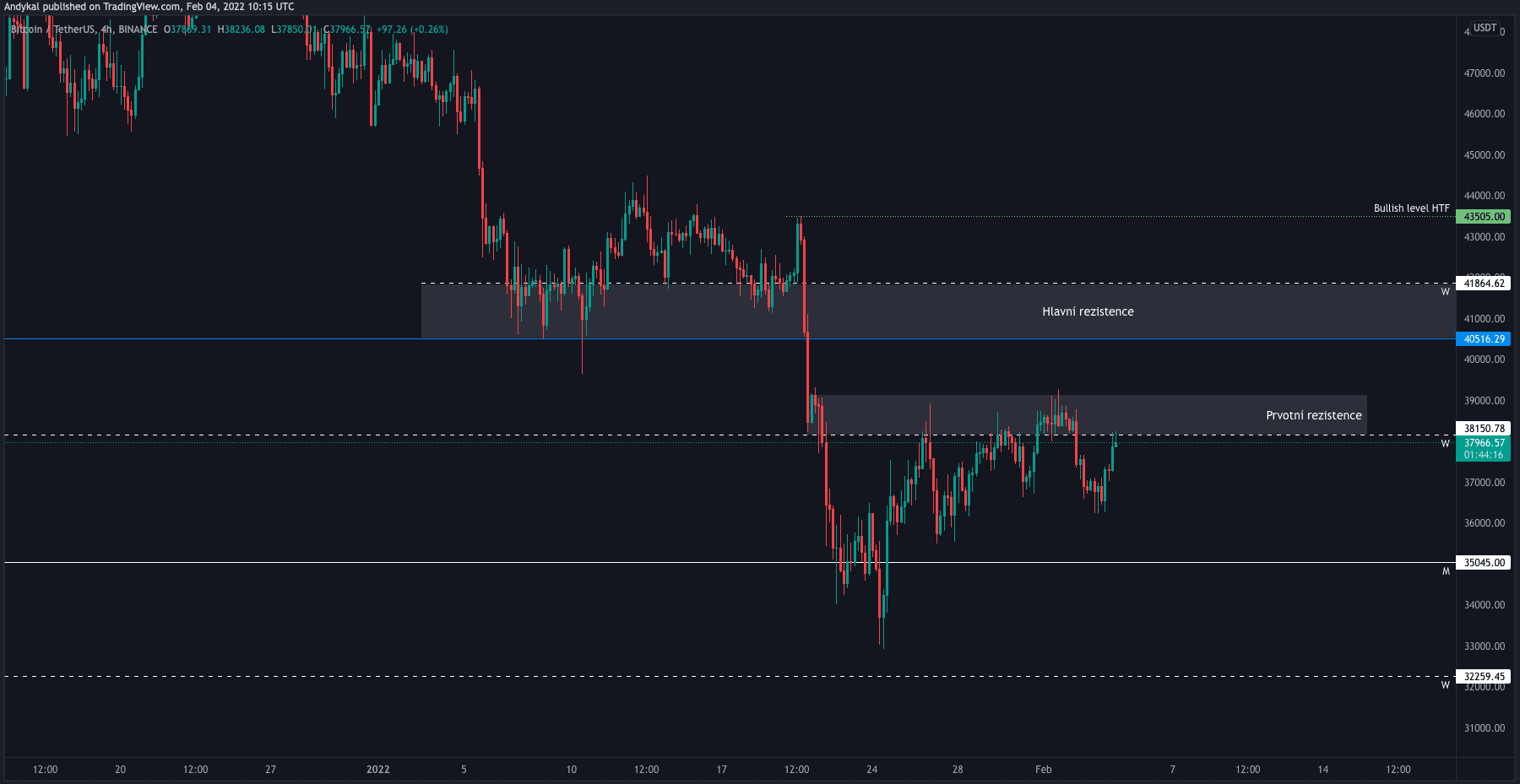 Na grafu výše, vidíme nejen pohyb v posledním týdnu, ale hlavně ty nejdůležitější supporty a rezistence, na které bychom měli dávat pozor. Jak víte, o hladinách 35 tis. a 41 tis. USD, jsem se zmiňoval už v posledním článku. Vzhledem k tomu, že od té doby ani jedna z nich nebyla otestovaná, stále to jsou ty nejdůležitější úrovně na grafu.