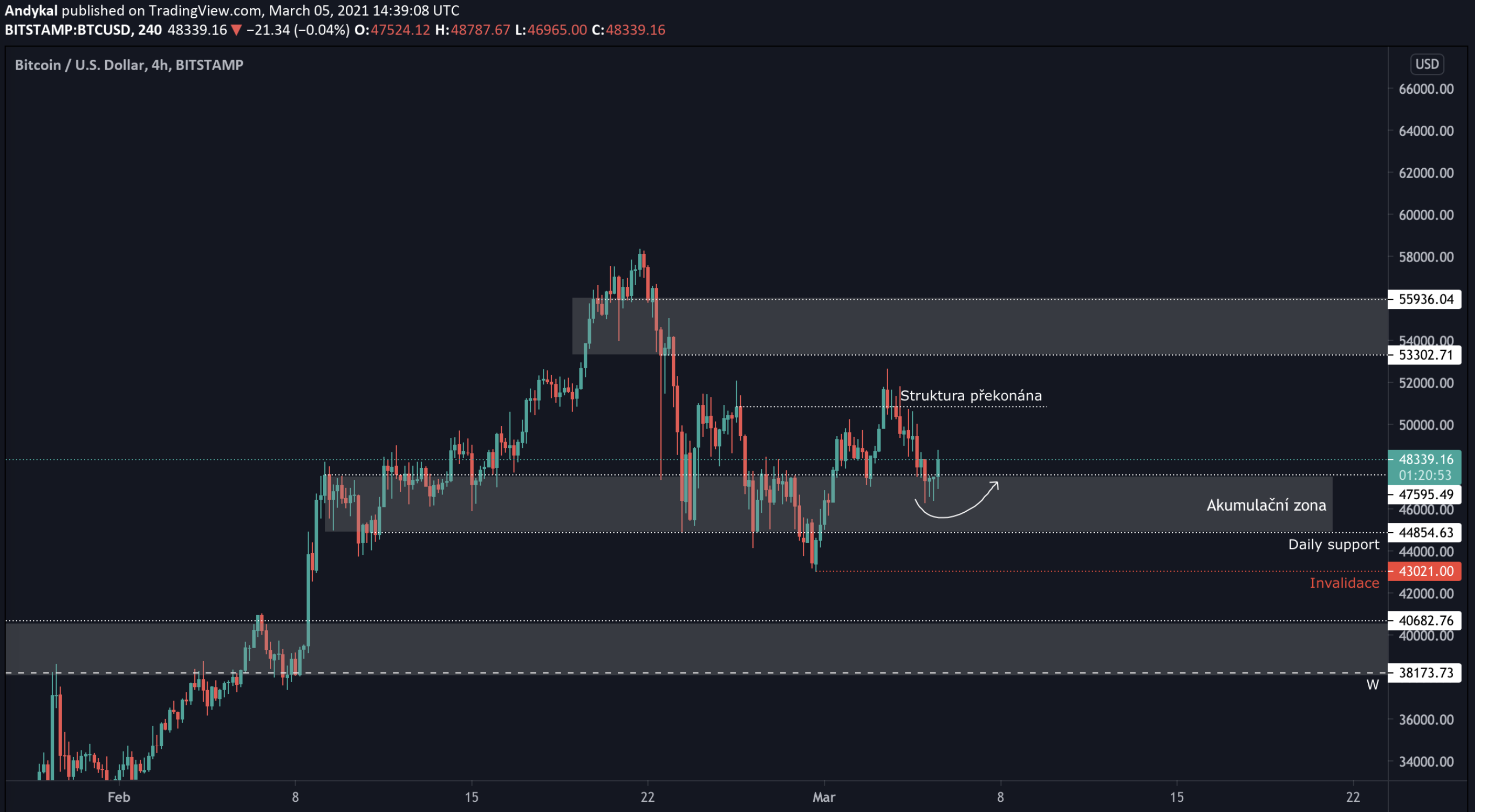 Sledovat nyní krátkodobé grafy, může být hodně matoucí. Jeden den je Bitcoin bullish, další den zase padá. Když se ale díváme na vyšší časové rámce, hovoří k nám graf celkem jasně – dokud BTC neztratií level 44800 USD, je bullish. A v této chvíli je právě ve velmi důležité akumulační zóně (47 500 – 44 800 USD).