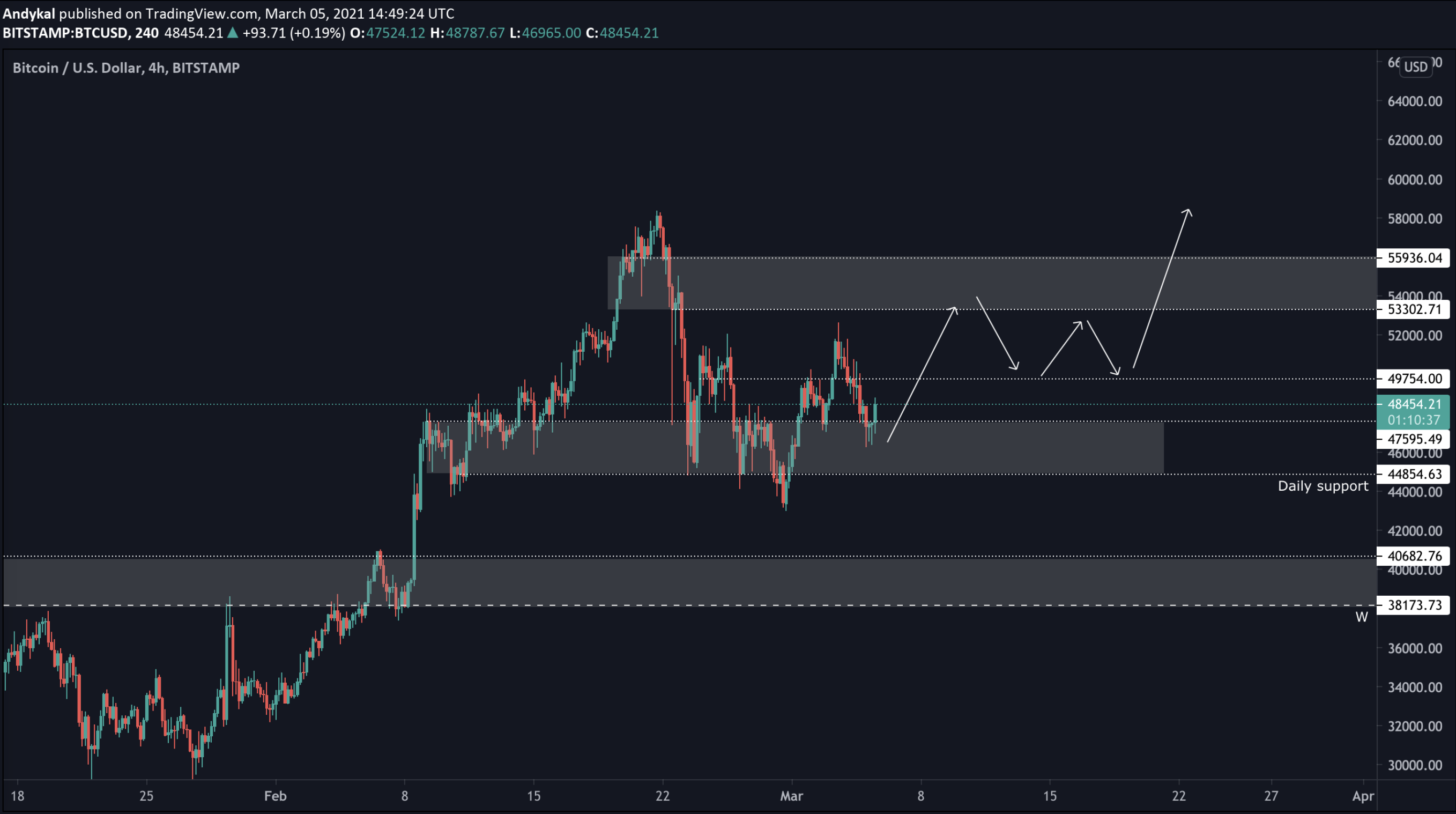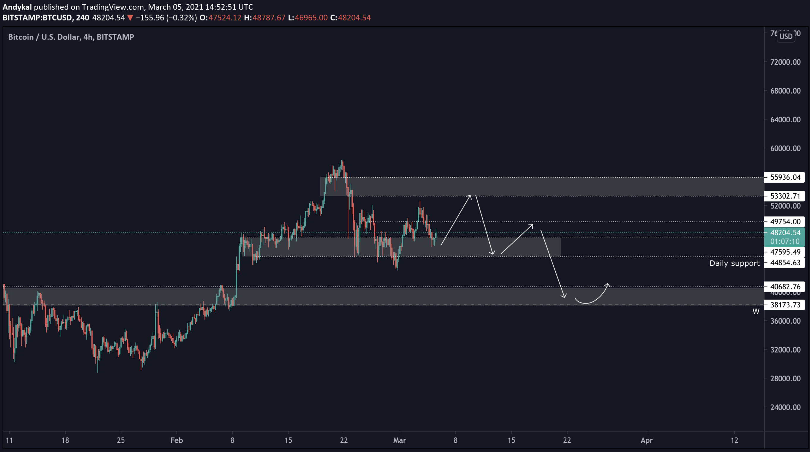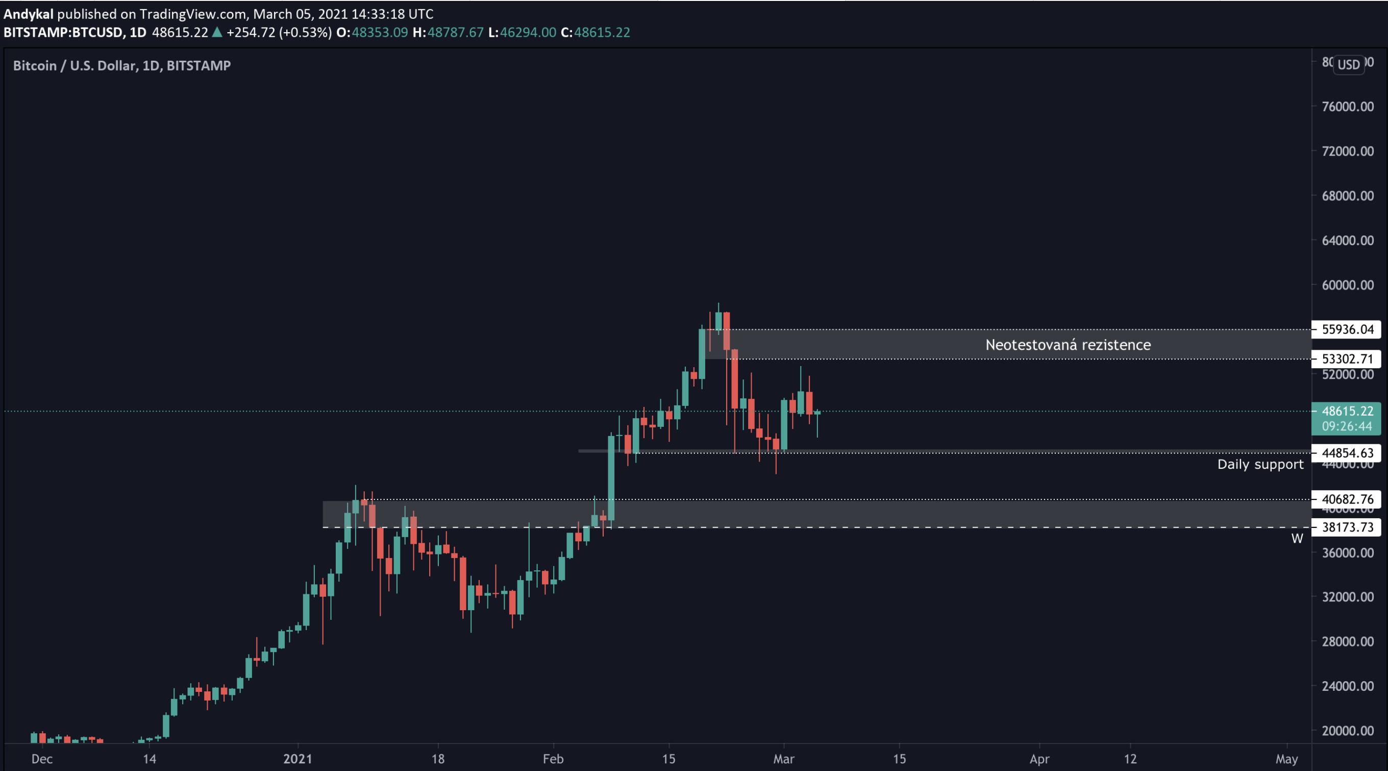 Pokud by náhodou ztratil daily level 44800 USD, tak se tento scénář invaliduje a pro odraz se díváme na další support kolem 40 tis. USD.
