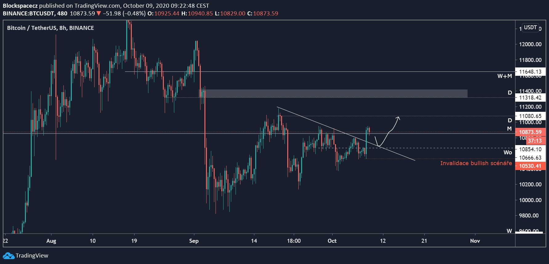 Co se týče analýzy kratších časových rámců, tam beru jako nejdůležitější level otevírací cenu tohoto týdne (Weekly open – Wo) na ceně 10666 (Binance).