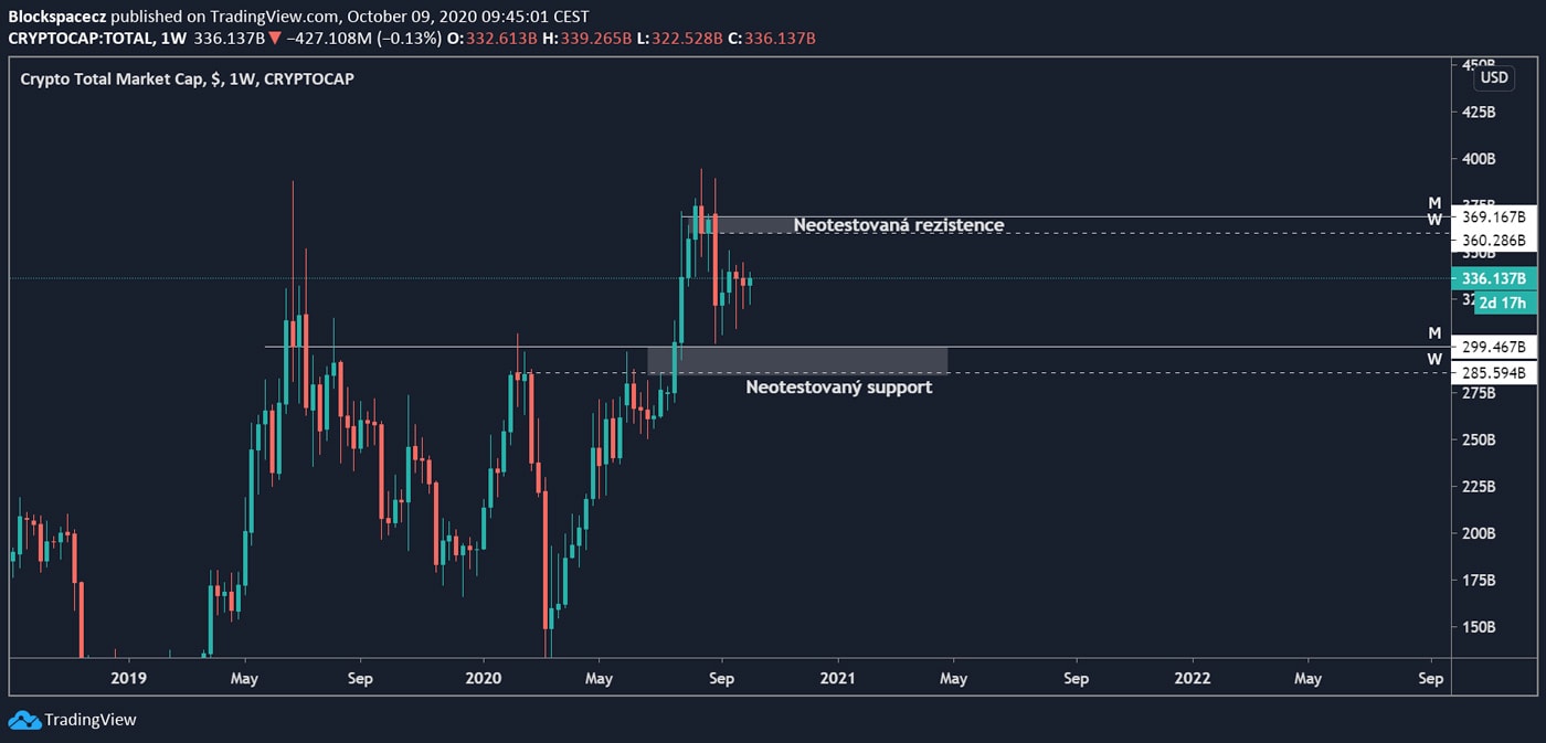 Podobnou situaci můžeme vidět i na grafu total market capu, neboli celkové tržní kapitalizace. Nad cenou jsou jasně vidět neotestované rezistence, naopak pod cenou jsou stále supporty, kterých se cena zatím nedotkla, ale pro pokračování v trendu by dávalo smysl je potvrdit.