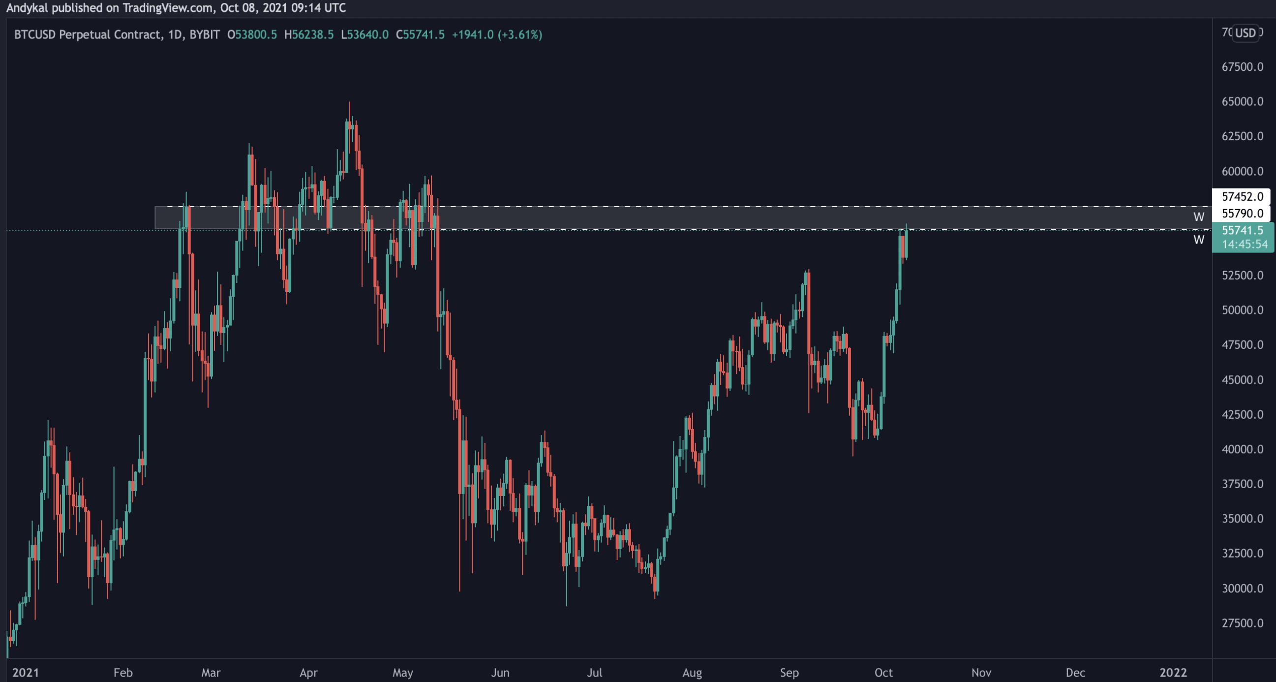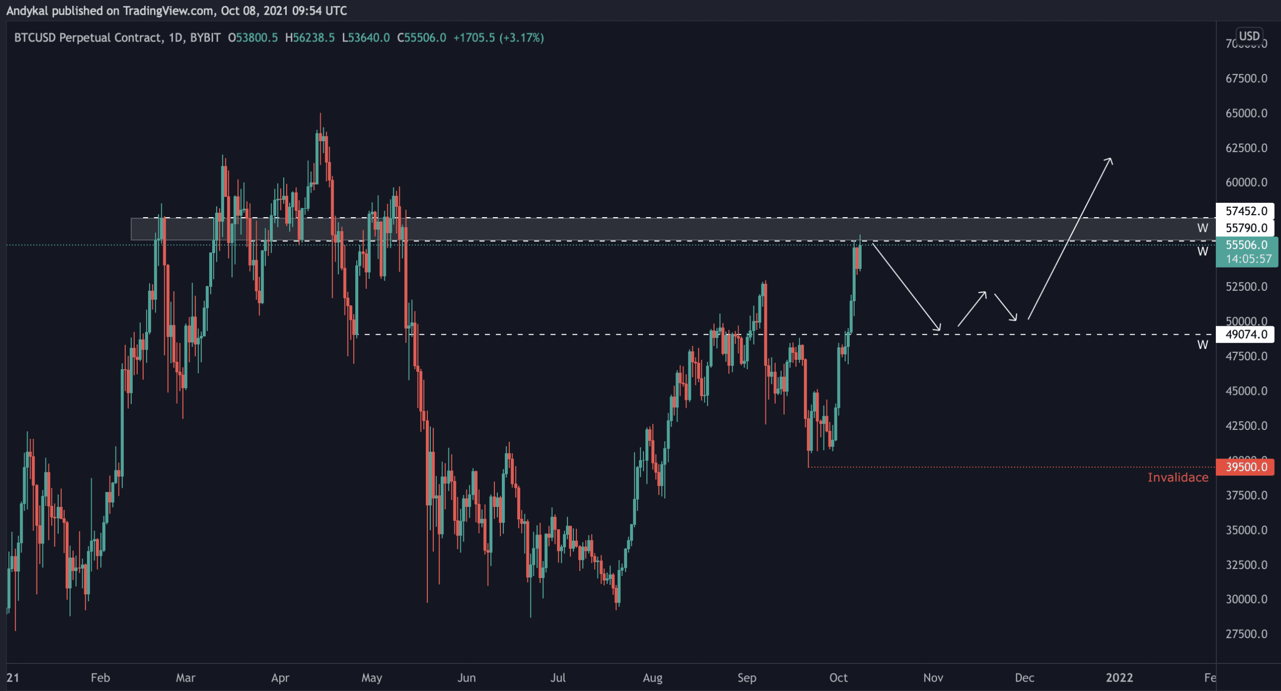 Druhá možnost je ta, že Bitcoin bude pokračovat ve své jízdě a uvidíme brzy proražení naší rezistence 56-57,5 tis. USD. Pokud by poté Bitcoin udělal vyšší high, nad cenou 60 tis. USD, celý proces by se pravděpodobně jen urychlil a scénář by proběhl podobně, jen o level výše.