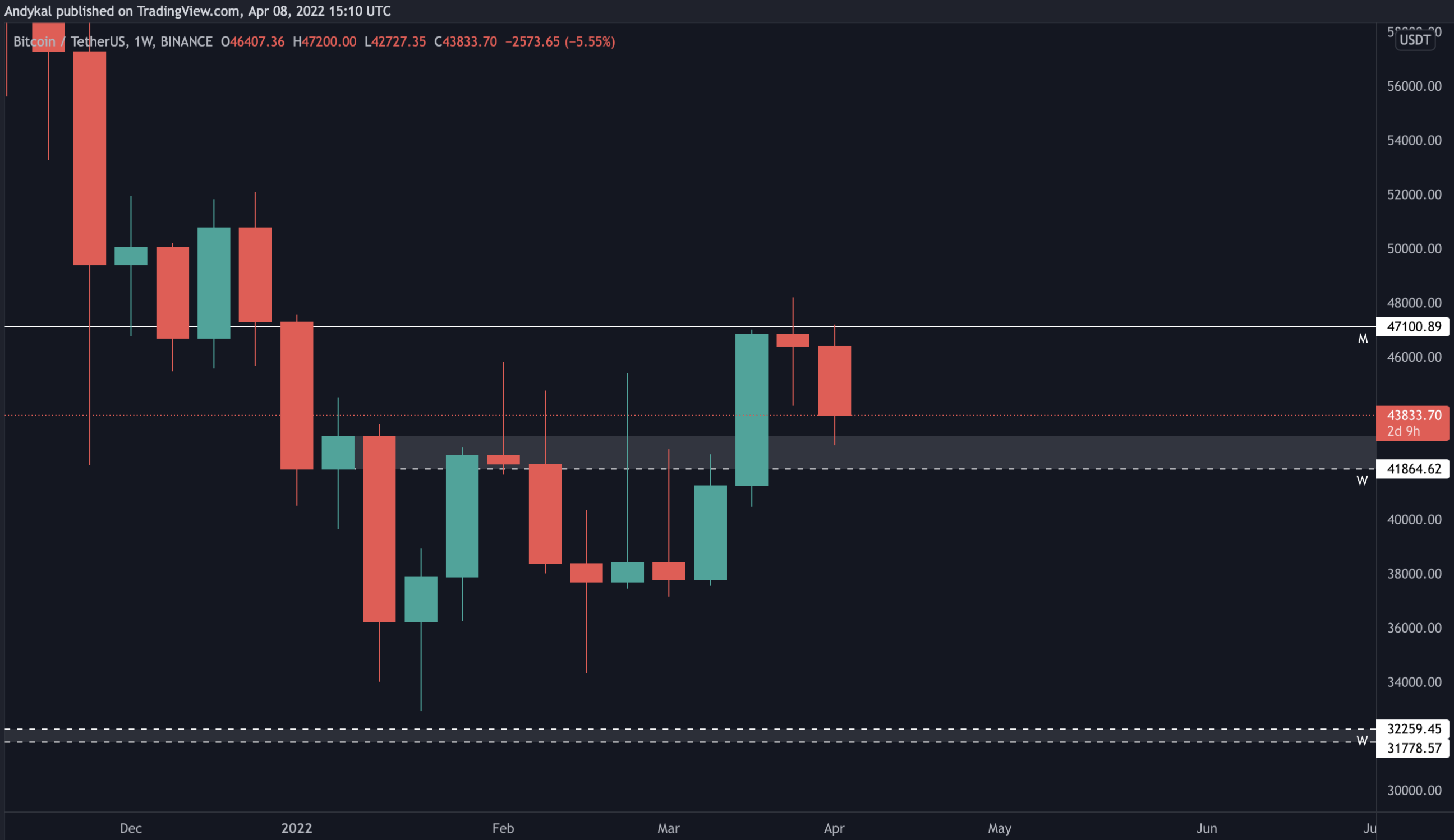 Na týdenním grafu výše, vidíme dva důležité levely. Cena 47 100 USD, což je rezistence měsíčního grafu a cena 41 800 USD, což je naopak velmi důležitý týdenní support.