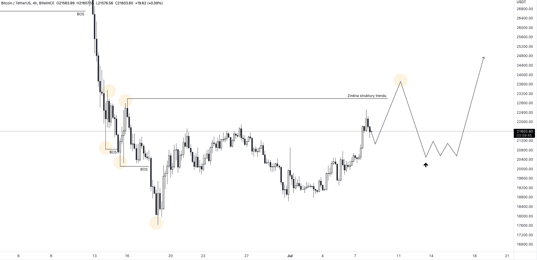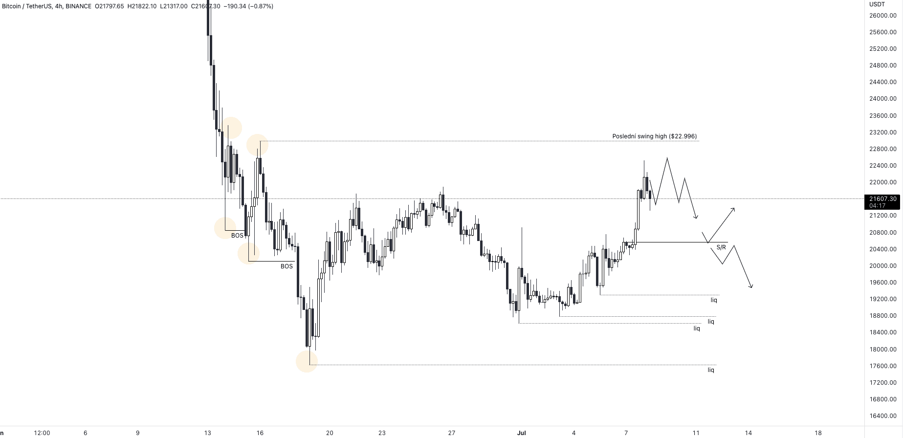 Aktuálně vidíme, že poslední nižší swing high bylo vytvořené na ceně 22 996 USD a swing low na 17 622 USD.