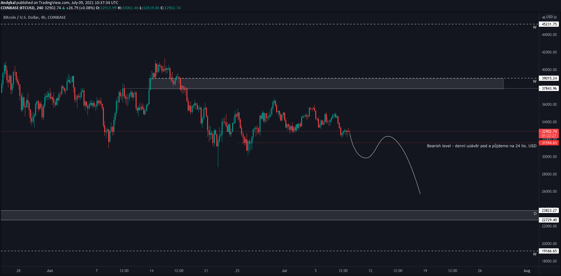 Bearish scénář není tak jasný, jako ten předchozí. Pokud bych to měl zjednodušit na to, co nám dá tak 80% šanci úspěchu, bude to opět sledovat denní uzávěr pod cenou 31500 USD.