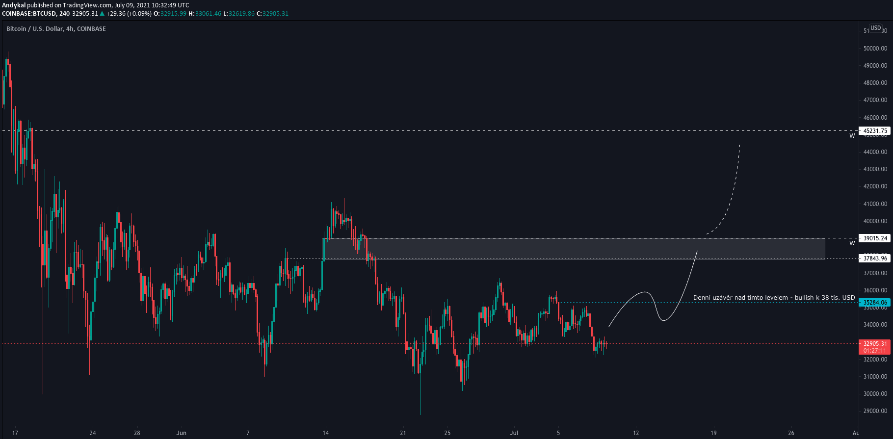 Zde nám půjde o jeden jediný level, a to 35 300 USD. Pokud nad touto cenou uzavřeme denní svíci, je možné považovat, že dno máme vytvořené a následující pullback nabírat long pozice, se kterými je možné mířit na 38-39 tis. USD, dlouhodobě případně až na 45 tis. USD.