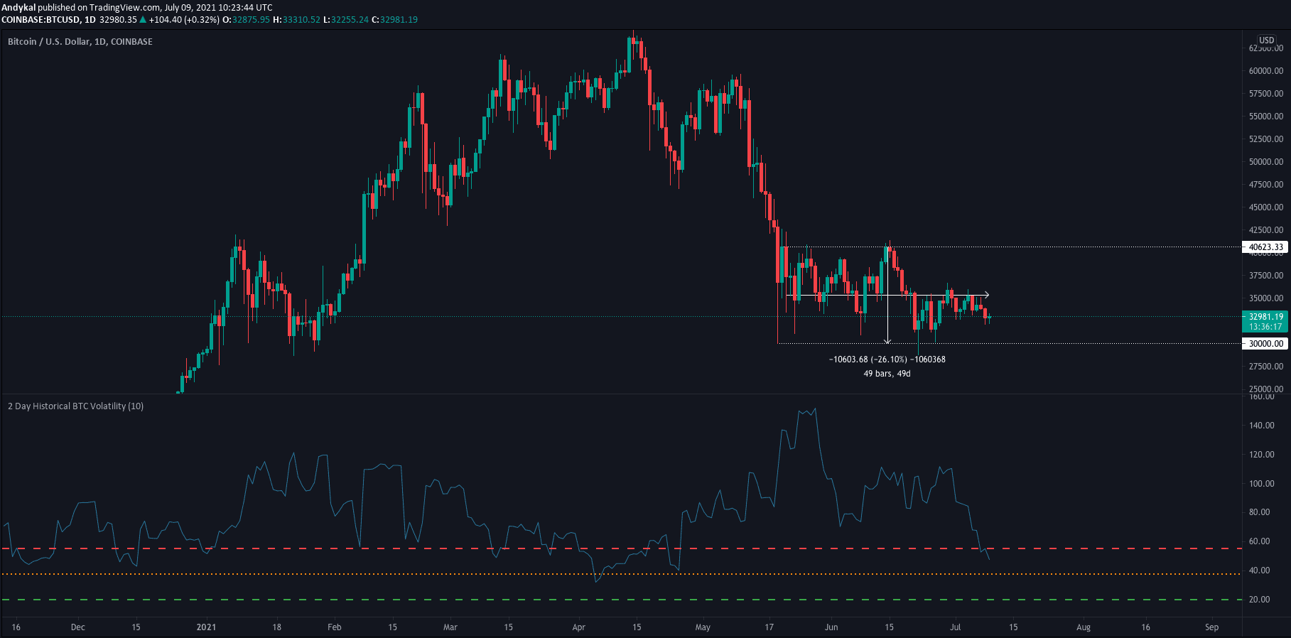 Celou situaci nám Bitcoin moc nezlehčuje tím, že, jak vidíme na dalším grafu, se v tomto rangi mezi 30-40 tis. USD pohybuje téměř 50 dní a range se neustále zužuje.