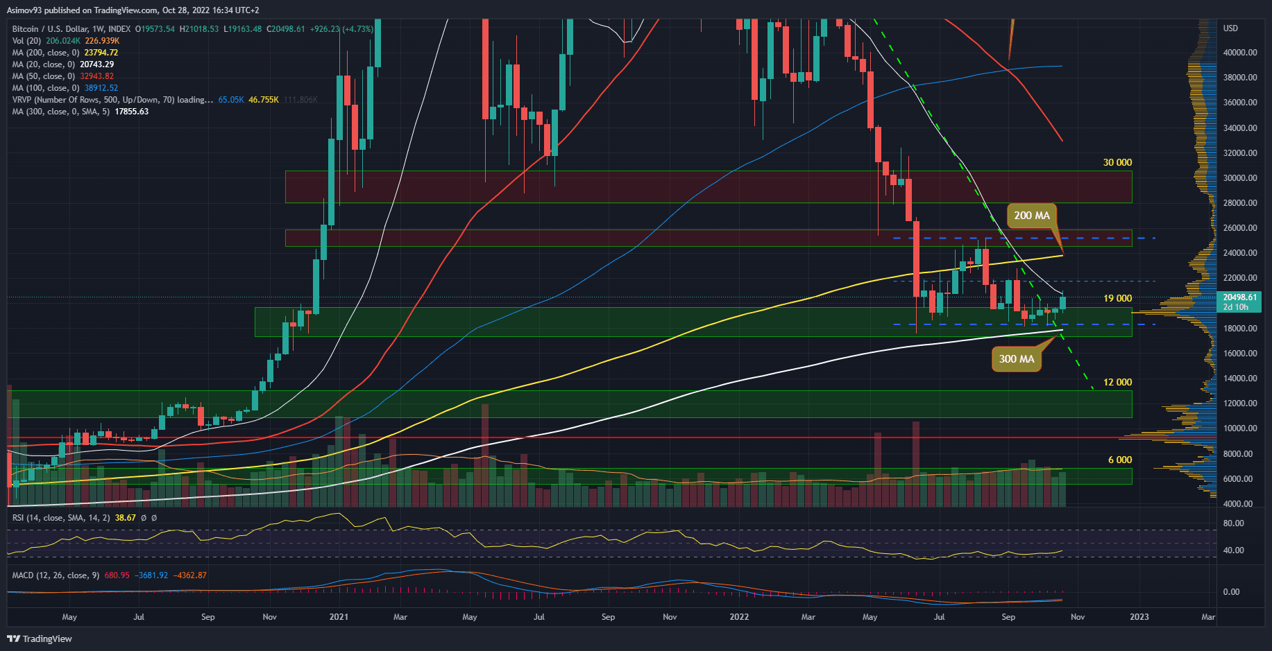 Předešlých šest týdnů označuji pro Bitcoin za tragické. Neboť jsme mohli v grafu sledovat šest týdnů v řade to samé týdenní close. Všechny pokusy o odraz, nebo průlom, skončily nezdarem a návratem ceny na support kolem 19 000 USD. A něco takového je do nebe volající.