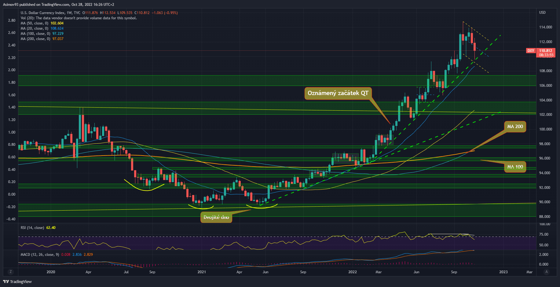 Jak vyplývá z týdenního grafu, technicky kurz DXY pouze otestoval zakreslenou trendovou diagonálu. A reakce je zatím spíše příznivá. Navíc je v blízkosti trendové linie i 20 týdenní klouzavý průměr a otestovali jsme zároveň vrchol z července. Takže tu máme vlastně supportní konfluenci. Tím pádem dolarový index zůstává vskutku býčí. Logicky s růstem kurzu roste tlak na akciový trh a krypto trh.