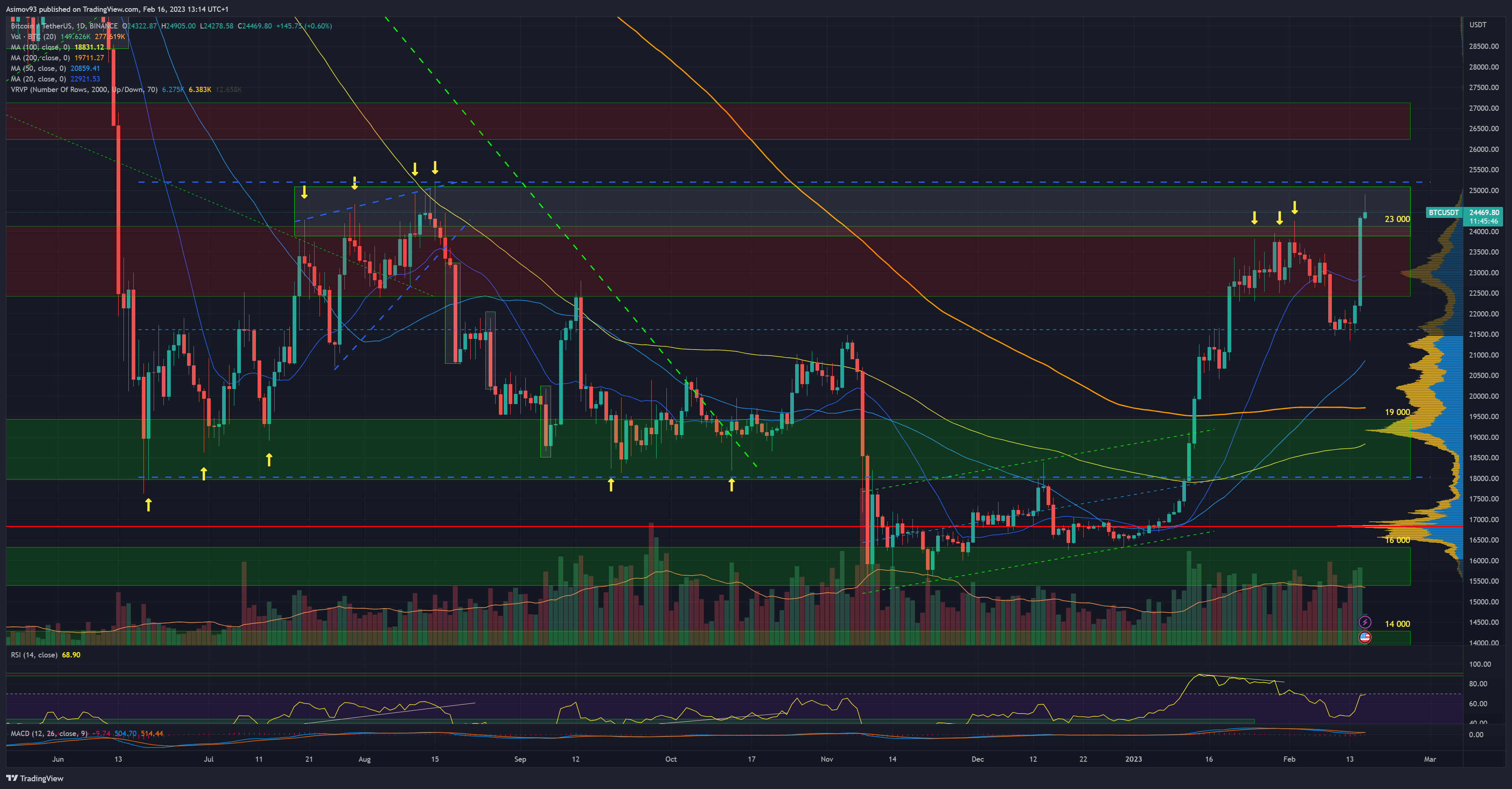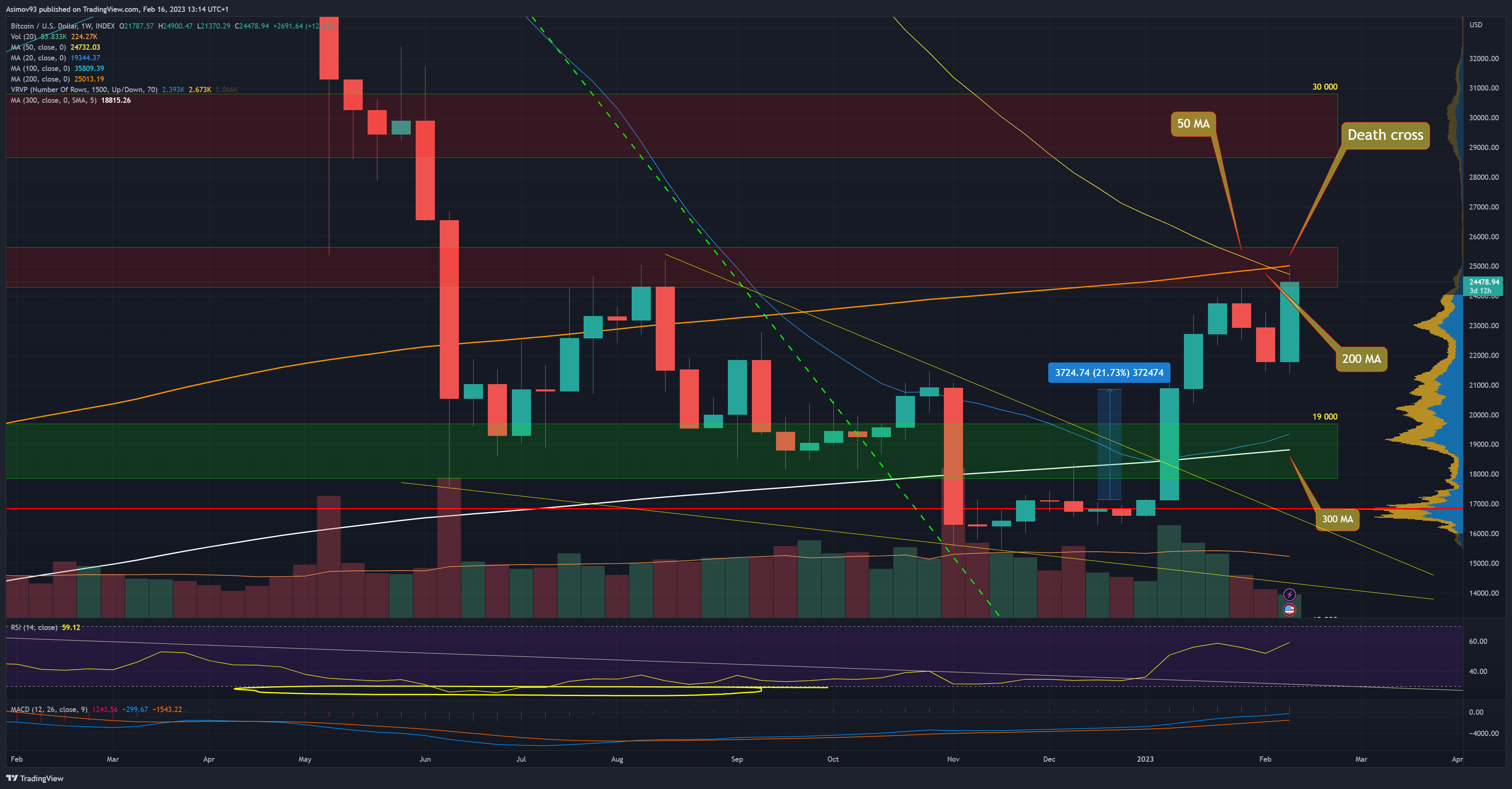 Z pohledu týdenního grafu nyní i dochází k otestování rezistenční konfluence, která je kolem 25 000 USD. Jsou zde zmíněné klouzavé průměry a cenová rezistence. Rezistence, která je velmi důležitá. Neboť se ji v létě minulého roku nepodařilo překonat. Což nakonec vyústilo v další pokles kurzu bitcoinu. Jinak všimněte si objemů. Z týdenního pohledu jsou zatím takřka nijaké. A to je problém. Respektive to smrdí býčípastí.