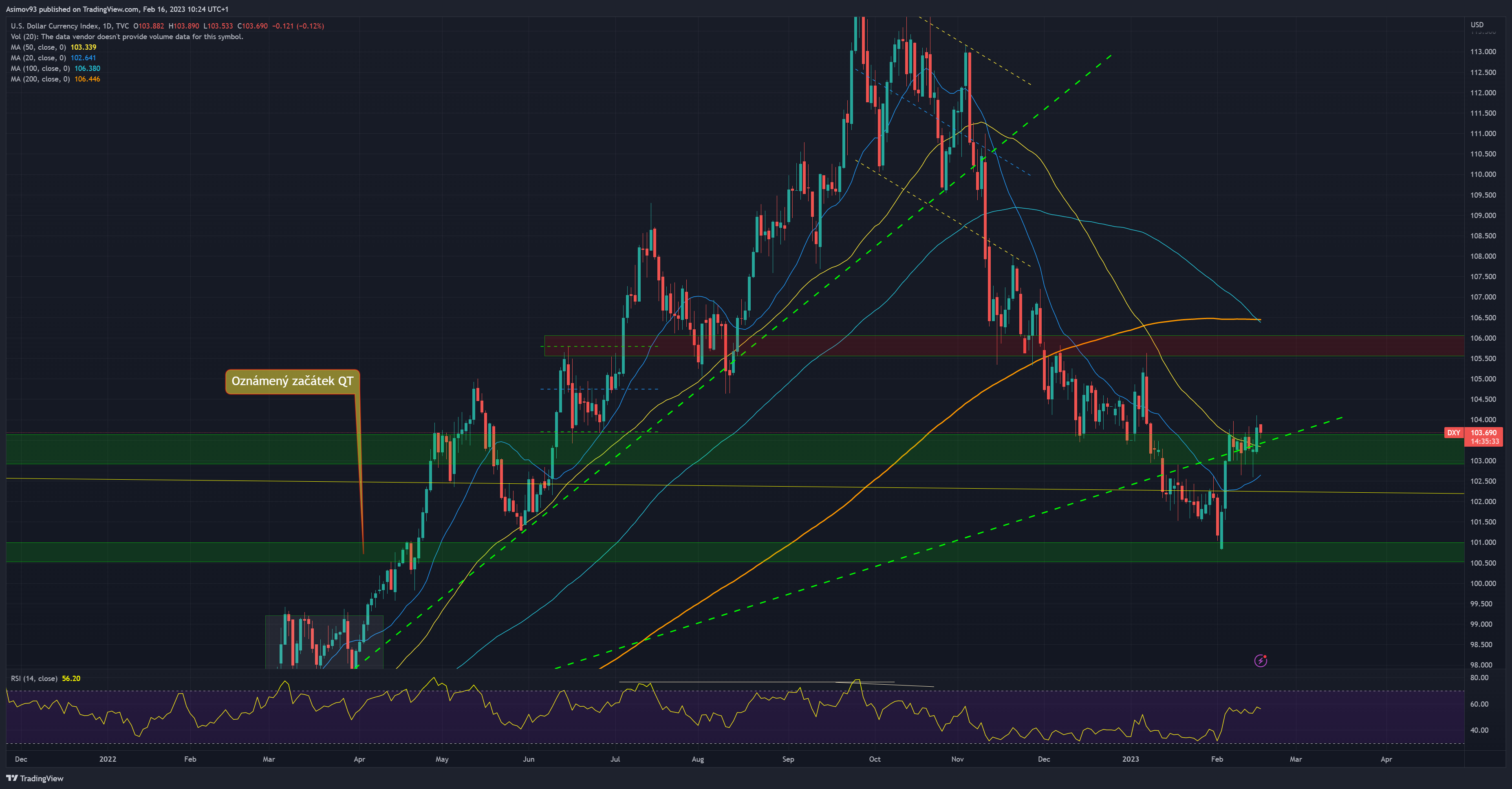 A nevíme, kdy přesně skončí. V obecné rovině se počítá s tím, že přijdou minimálně dva kosmetické hiky. To znamená dvojnásobné navýšení o 0,25 procentního bodu. Leč Fed zdůrazňuje, že je jejich politika “data dependent”. To znamená, že když inflace nebude soustavně polevovat, mohou přitvrdit. Proto je třeba se zaměřovat nejenom na kurzový průběh a být řekněme otrokem různých FOMO.