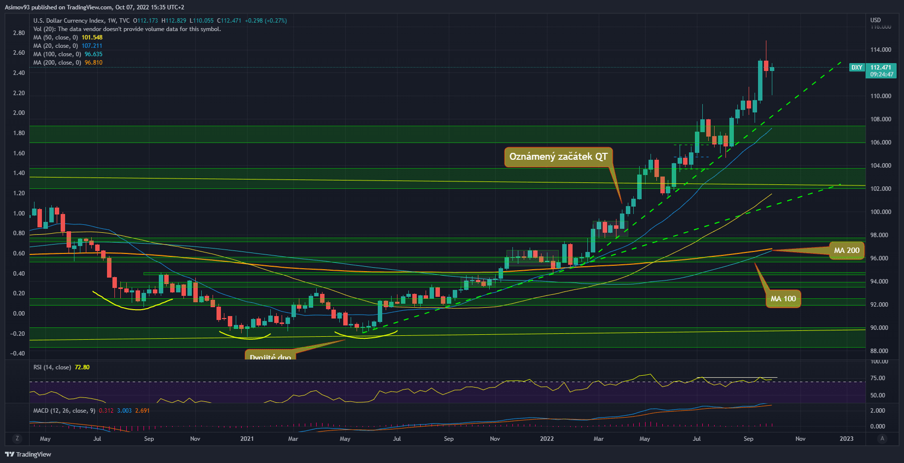 A dolarový index na tento cyklus růstu sazeb reaguje velmi dobře. Každý propad berou spekulanti jako klasické “buy the dip“. Díky tomu index od května 2021 soustavně stoupá a v současnosti se nachází na úrovních, kde byl kurz posledně někdy v roce 2002. Což logicky drtí všechny ostatní světové měny. A hned vedle toho i akciový trh a Bitcoin.
