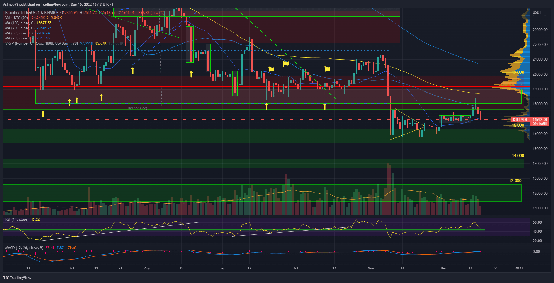 Bitcoin má mnohem méně afektovaný kurzový průběh, než mají akciové trhy. Což je zajímavá změna něco podobného sledovat. Nic to ale nemění na tom, že je na tom Bitcoin technicky bledě. Šance na průlom 19 000 USD jsou pramalé. A první, možná poslední v letošním roce, otestování to potvrzuje. Jestli se kurz dostane na 16 000 USD a level padne, další slabší support je na 14 000 USD. Ten “beton” začíná až na těch 12 000 USD. A nyní jsme opravdu blízko.