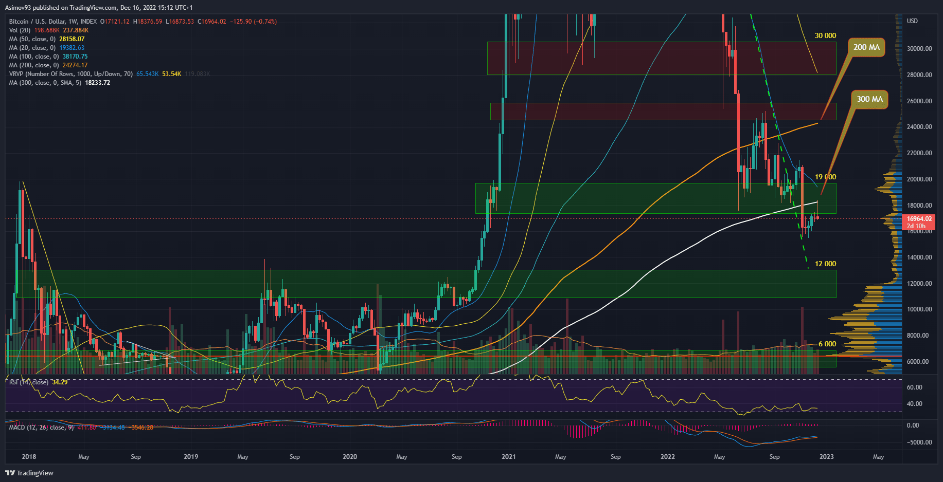 Dle týdenního grafu nás čeká první opravdu likvidní pásmo až kolem 12 000 USD. Na tuhle úroveň čekáme už dlouho. Je to první skutečně důležitá zastávka v rámci medvědího trhu, který u Bitcoinu trvá více jak jeden rok. Nikdo přirozeně neví, jak hluboko půjdeme. Ale ta pravděpodobnost otestování 12 000 USD je vysoká. Kurz bitcoinu je od sledovaného pásma velmi blízko.