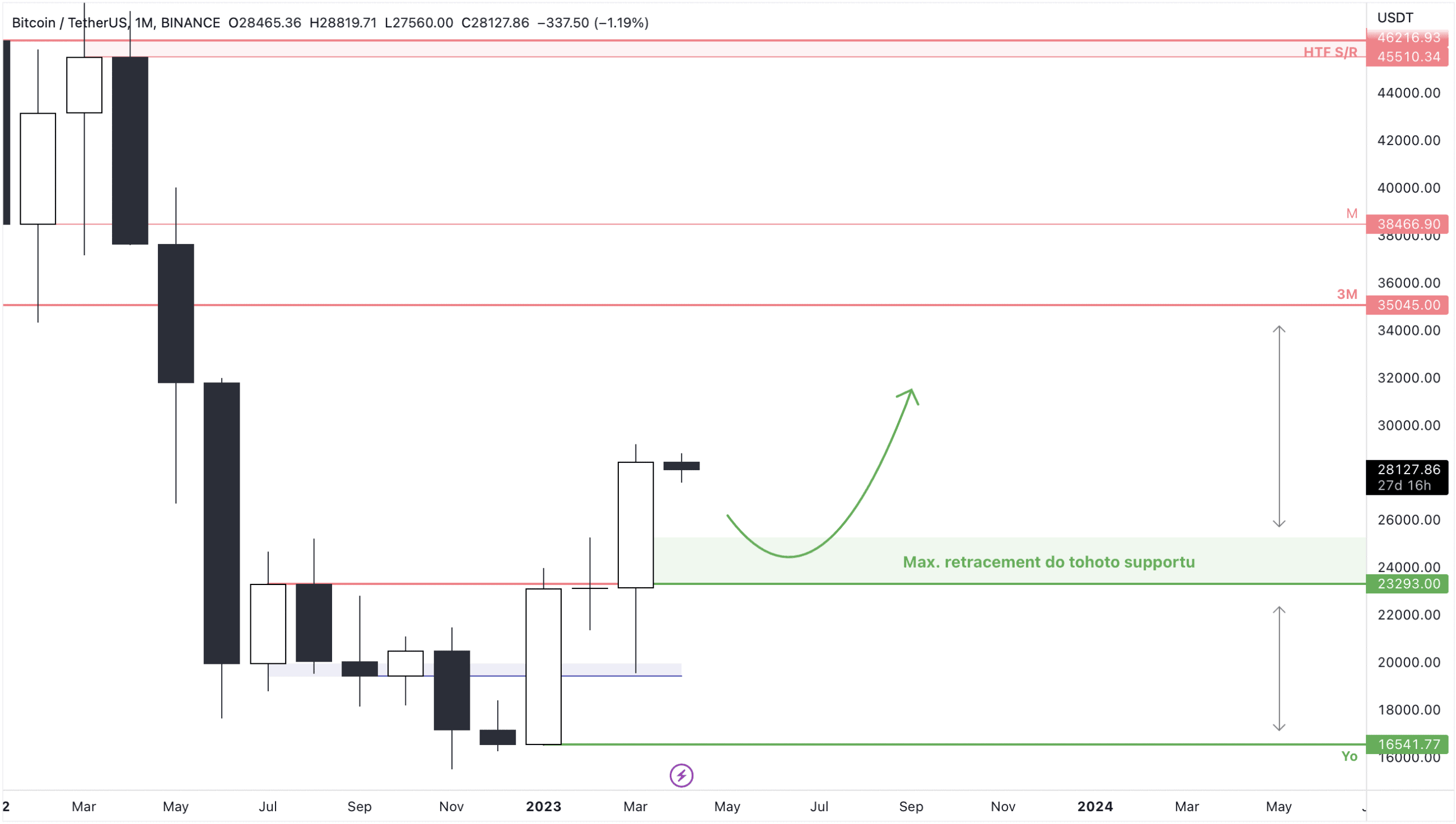 Během března jsme na grafu BTC viděli silný propad k otestování modrého supportu, a poté silné vytažení ceny nahoru, nad rezistence kolem 24 tis. USD. Ta se nyní proměnila v support a nižší důležité supportní úrovně jsou již otestované.