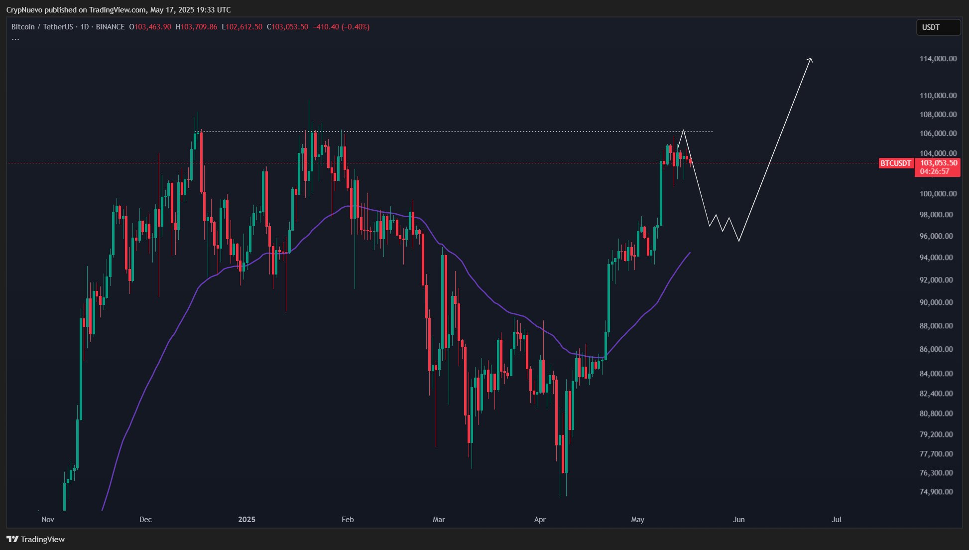 Svou tezi zakládá na technické analýze. Na grafu vidí sbližující se trojúhelníkový vzorec s klesajícím objemem obchodů.