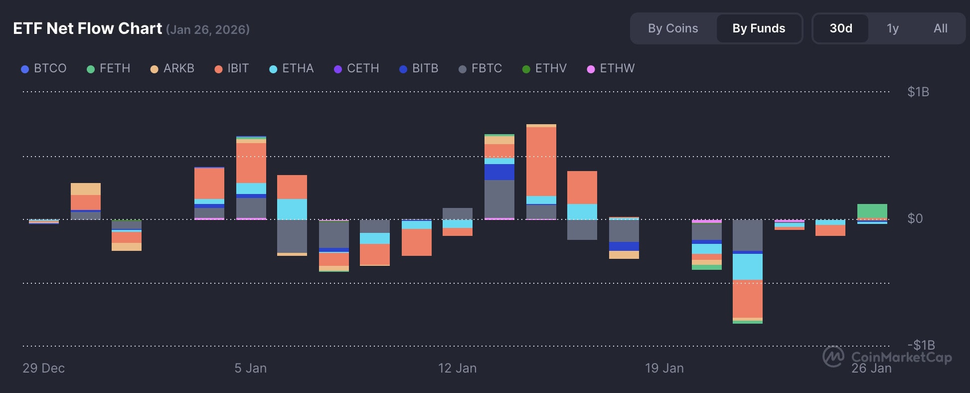 Sedmého ledna šlo o -486,1 milionu, osmého ledna o -398,8 milionu a devátého ledna o -250 milionů dolarů. Rychlé střídání přílivů a odlivů ukazuje, jak snadno se investiční toky do ETF znovu otevírají a uzavírají při změně chuti riskovat.