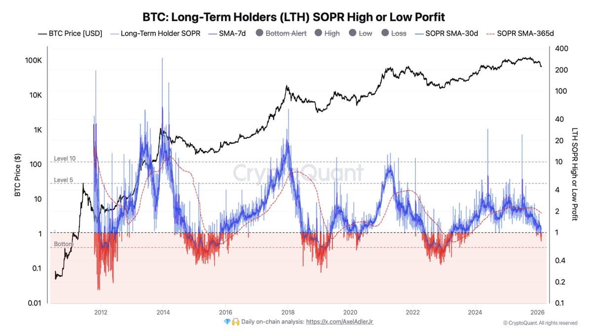 Hlavním sledovaným indikátorem je zde SOPR (Spent Output Profit Ratio, měří zisk/ztrátu) pro dlouhodobé držitele. Tento ukazatel poprvé od konce medvědího trhu v roce 2023 klesl pod hodnotu 1, konkrétně na úroveň 0,88.