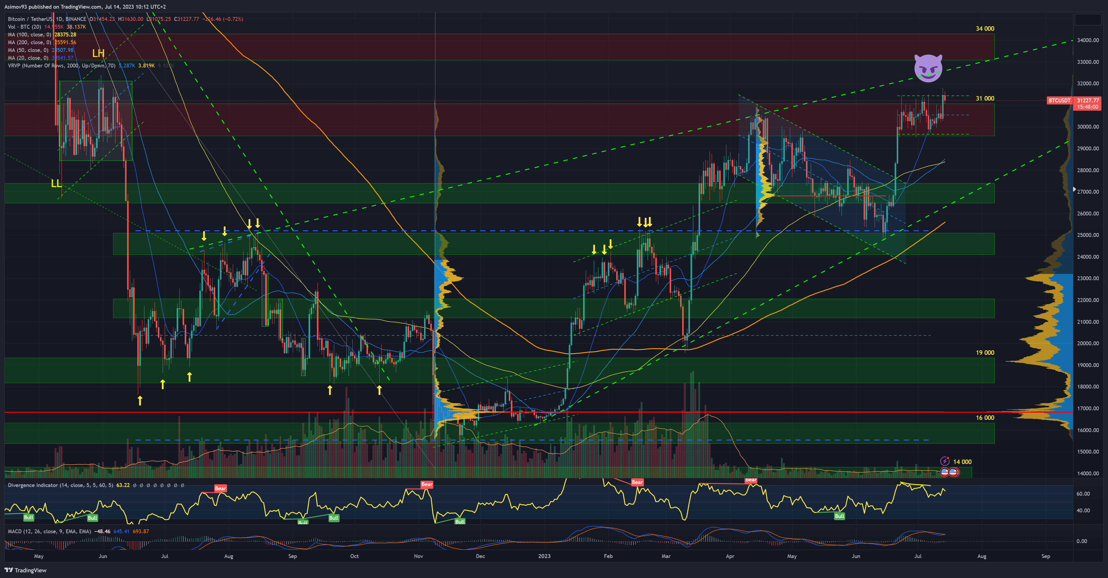 Stranové pásmo se tvoří už tři týdny. To je dostatečný důvod si myslet, že nás brzy čeká někam průlom. Kurz bitcoinu má viditelně problém 31 500 USD překonat.