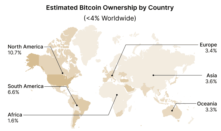 Co se týče fyzických osob, tak podle reportu méně než 4 % světové populace vlastní tuto kryptoměnu. V čele žebříčku jsou lidé ve Spojených státech, kde až 14 % obyvatelstva vlastní Bitcoin.