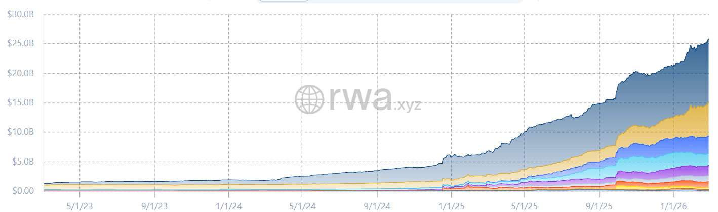 Pokud nevezmeme v potaz stablecoiny, hodnota tokenizovaných aktiv na blockchainech přesahuje 25 miliard dolarů.