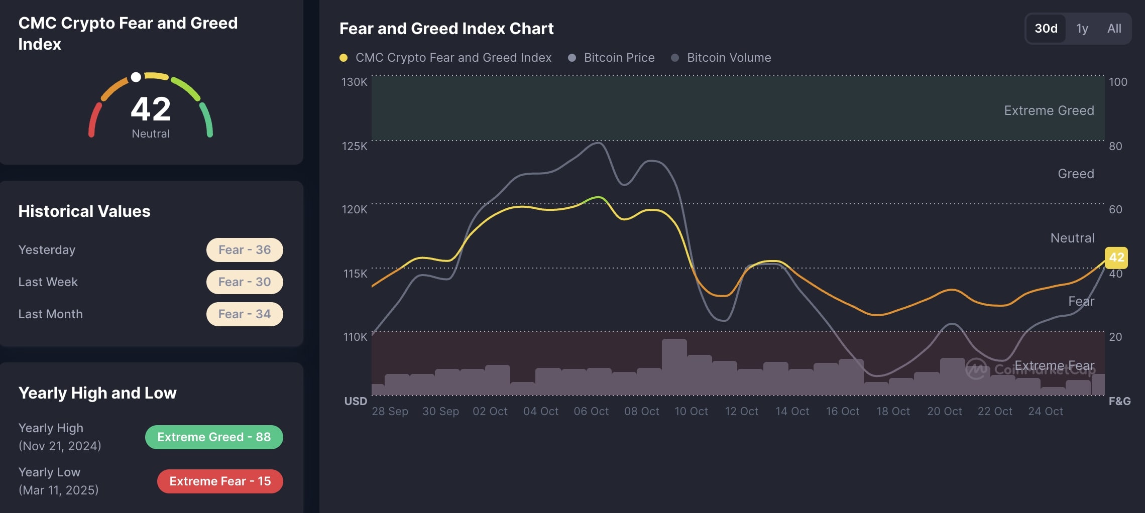 Indikátory nyní opět naznačují posílení poptávky a zlepšení celkového sentimentu. Podívejme se například na Fear & Greed Index, který se po dlouhém období vrátil zpět do neutrálního pásma: