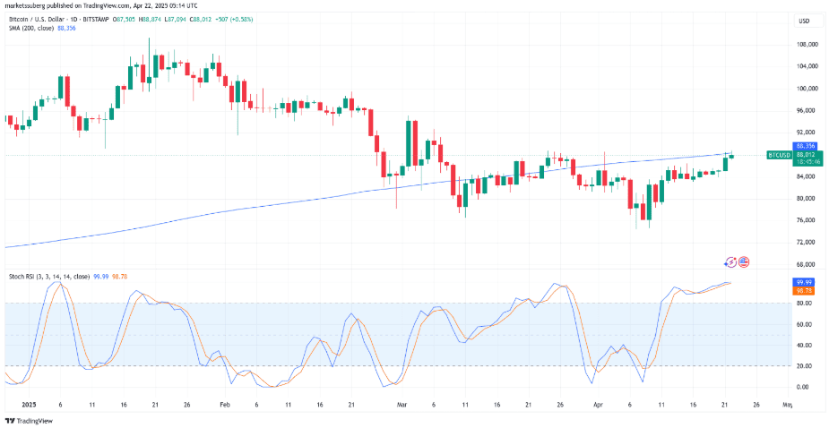 Právě 200denní klouzavý průměr funguje jako support během býčích fází na Bitcoinu. V březnu ale došlo k prolomení této supportní úrovně díky silnému prodejnímu tlaku, který byl způsoben začínajícími celními opatřeními.