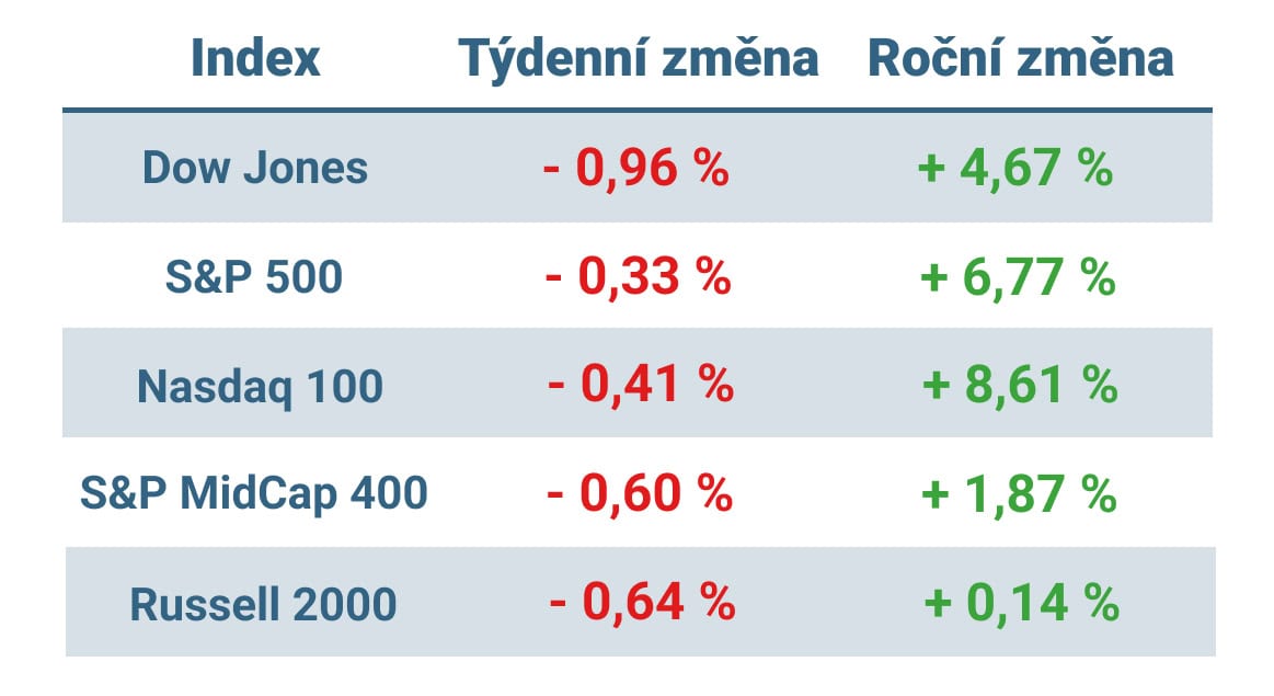 Hlavní americké akciové indexy zakončily týden mírným poklesem, přičemž nejlépe si vedl široký tržní index S&P 500 následovaný technologickým Nasdaq 100.