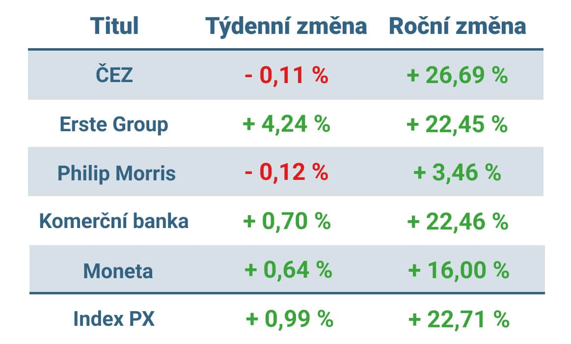 Pražská burza v týdnu opět posílila a index PX zakončil týdenní obchodování na hodnotě 2 169 bodů, což představuje týdenní zisk 0,99 %.