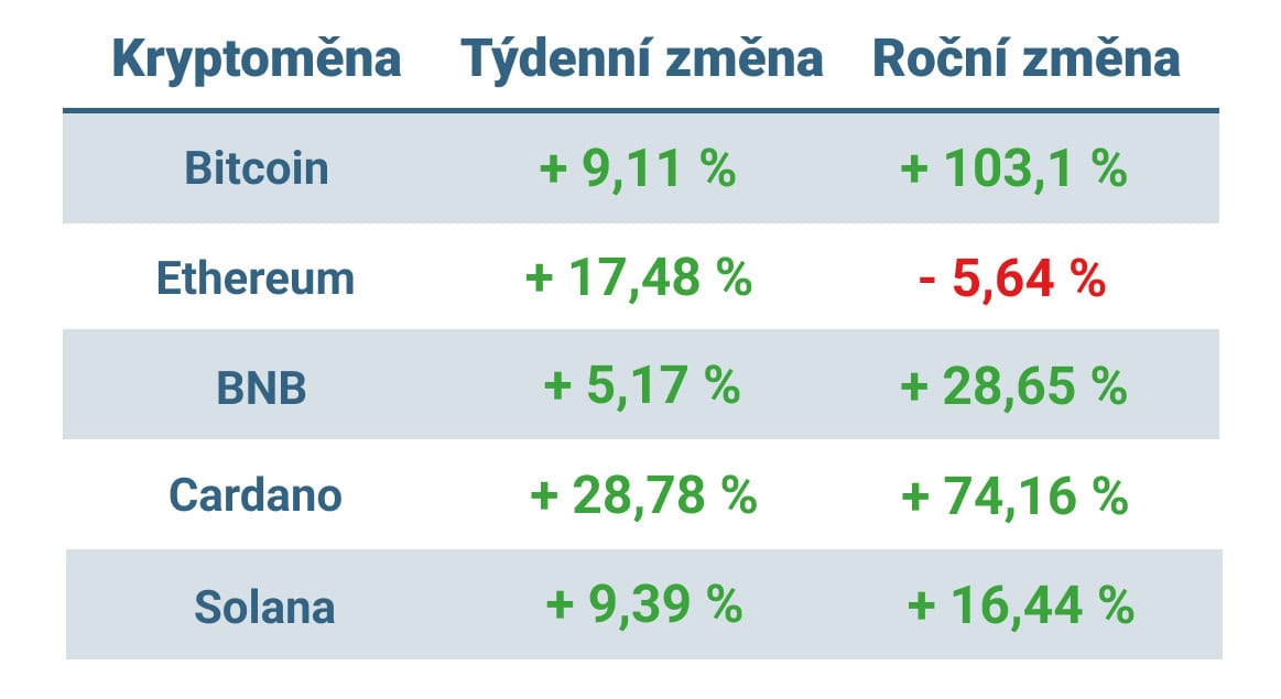 Zisk dokonce přes 17 % si v týdenním srovnání připsala druhá největší kryptoměna Ethereum, která se aktuálně obchoduje jen lehce pod úrovní3 000 dolarů za ether. V meziročním srovnání však Ethereum stále ztrácí více než 5 % hodnoty.