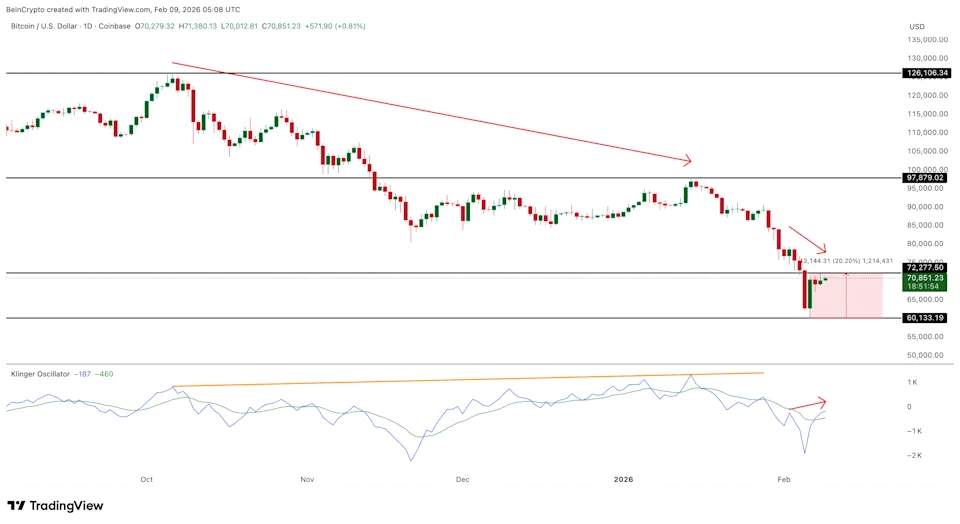 Mezi 6. říjnem a 14. lednem Bitcoin klesl zhruba ze 126 000 na 97 800 dolarů. Pokles dosáhl přibližně 22 procent. Během období však Klingerův oscilátor rostl.