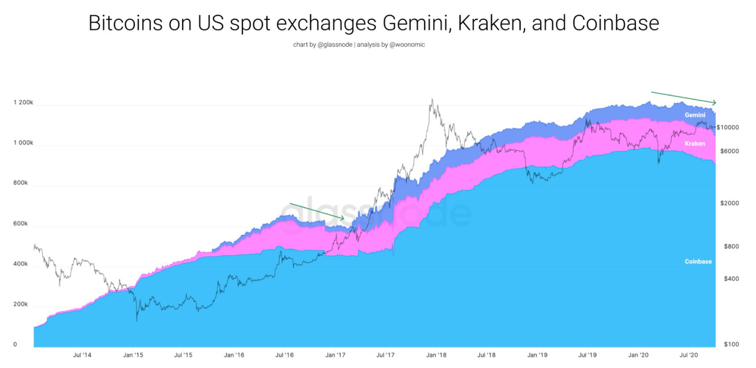 Analytik Willy Woo a analytická společnost Glassnode spojili síly a vytvořili graf vývoje počtu BTC na amerických burzách. Ten ukazuje, že uživatelé stahují peníze z burz a přesouvají je na soukromé peněženky, což je klasický ukazatel vzniku nových hodlerů.