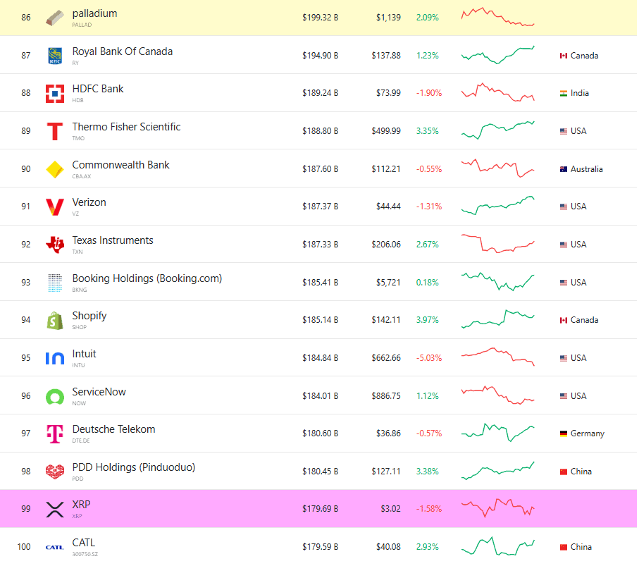 XRP se naopak dostalo do žebříčku 100 nehodnotnějších aktiv světa a je tak cennější než firmy jako Allianz, Accenture nebo Boston Scientific.