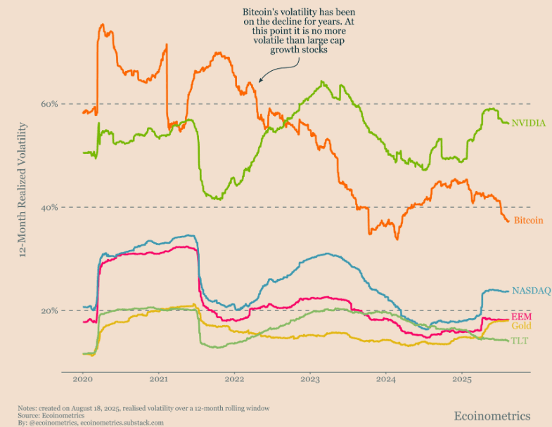 Dokonce 30denní realizovaná volatilita Bitcoinu je na nejnižší úrovni za posledních 5 let. Od roku 2022 je méně volatilní než akcie technologické společnosti Nvidia.