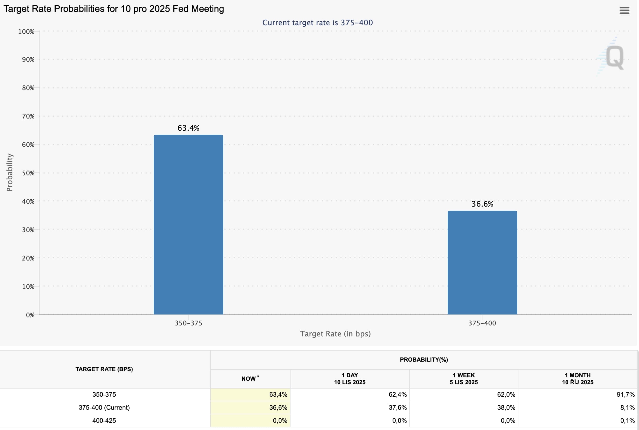 Podle nástroje CME Group FedWatch existuje aktuálně 63,4% pravděpodobnost, že Fed sníží sazby na prosincovém zasedání 9.–10. prosince.
