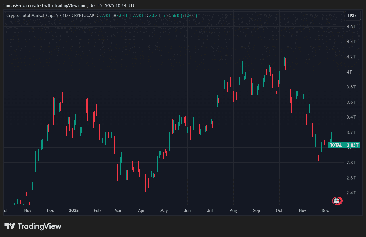 Celková tržní kapitalizace kryptoměn dosahovala přibližně 3,15 bilionu dolarů. Hodnota byla za posledních 24 hodin nižší asi o 0,8 %. Denní objemy obchodů činily zhruba 89 miliard dolarů.