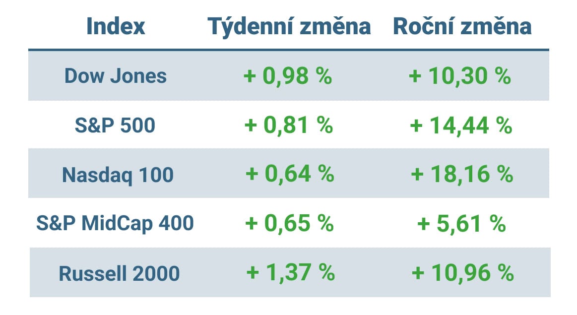 Tabulka ukazuje vývoj nejvýznamnějších amerických indexů v tomto týdnu a v roce 2025