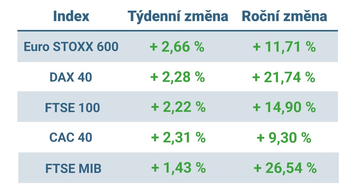 Tabulka ukazuje vývoj nejvýznamnějších evropských indexů v tomto týdnu a v roce 2025