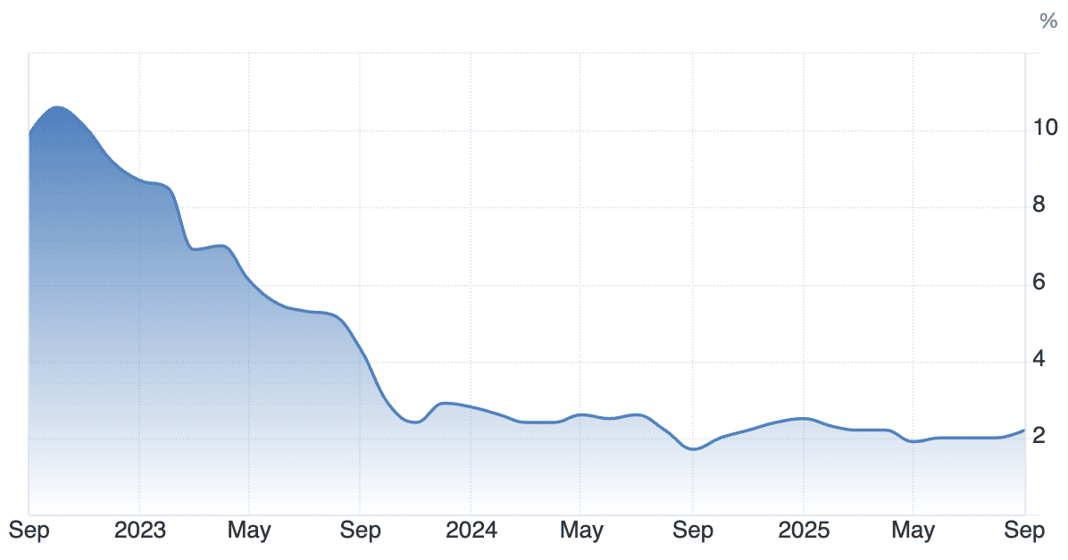 Celková roční inflace v eurozóně zrychlila v září na 2,2 % z 2,0 % v srpnu v důsledku vyšších nákladů na služby a mírně pomalejšího poklesu cen energií.