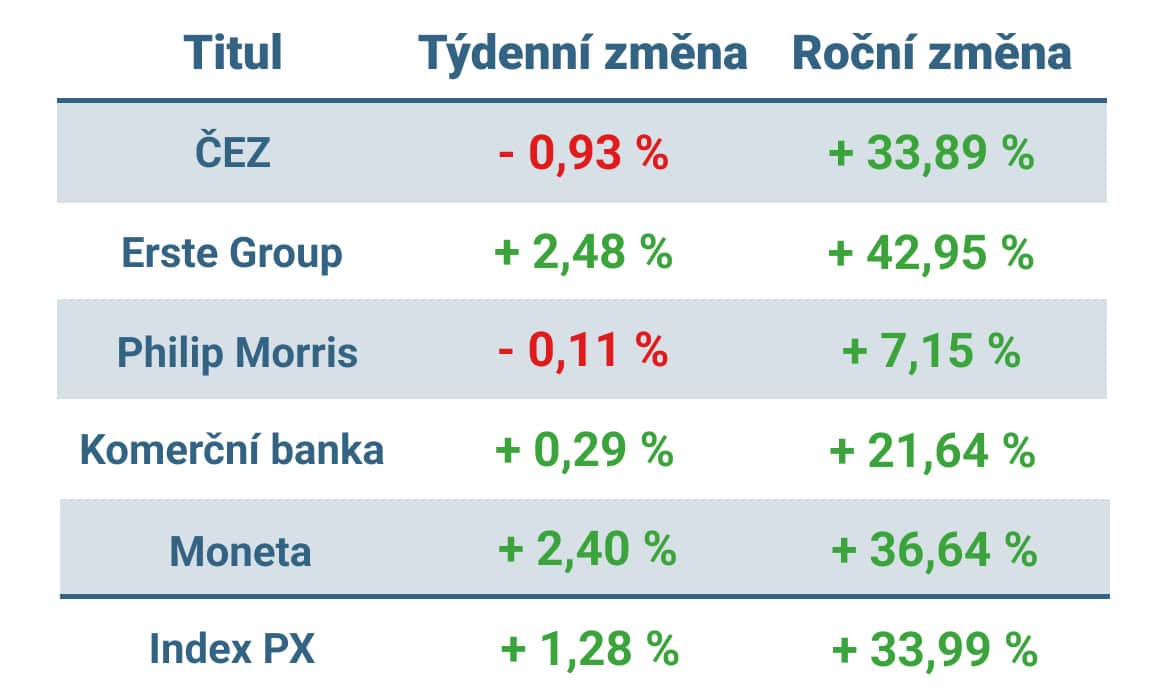 Vývoj ceny nejvýznamnějších titulů obchodovaných na pražské burze v tomto týdnu a v roce 2025