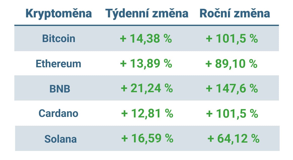 Dařilo se ale i dalším kryptoměnám. Ta druhá největší – Ethereum – posílila v týdenním srovnání o necelých 14 % a v neděli ráno se obchoduje nad úrovní 4 500 dolarů.