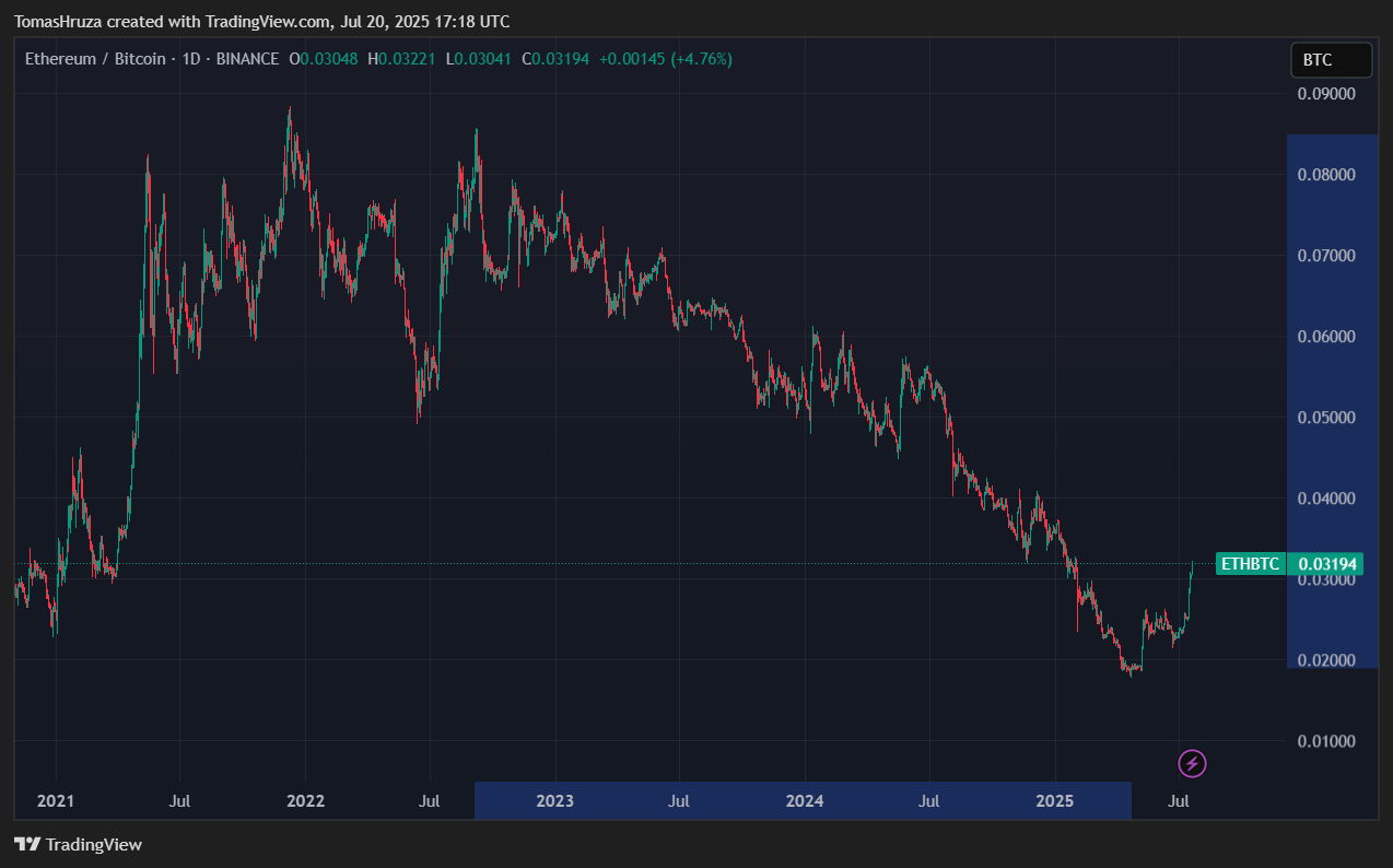 Cenový vývoj obchodního páru ETH/BTC